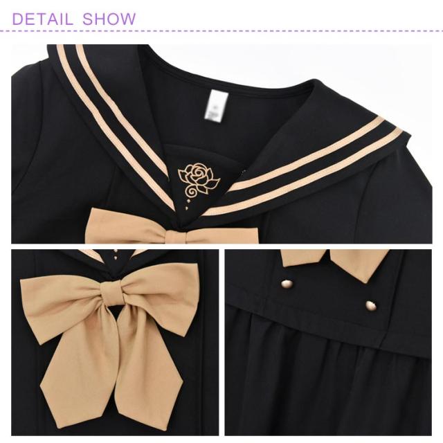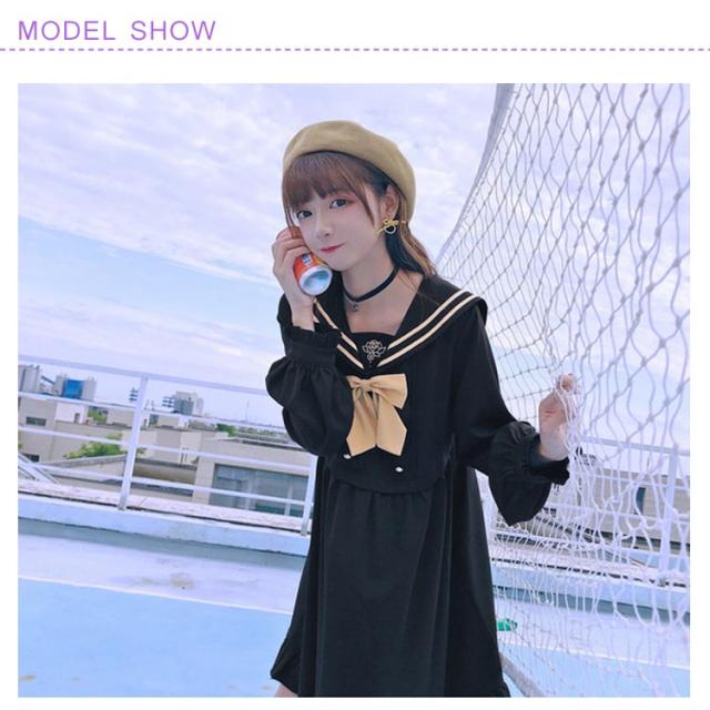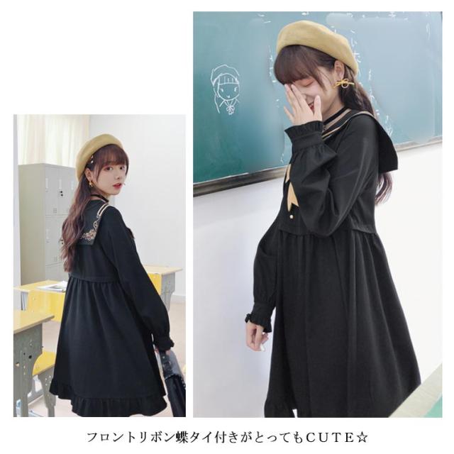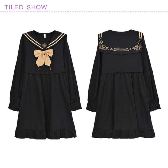 | 憧れたセーラーワンピース新タイプ誕生しました! 大きめのセーラーカラーのバック部分はローズ刺繍入ります。 フロントリボン蝶タイ付きがとってもCUTE☆ ウエストからふんわり裾に広がりオンナノコらしさを見せてくれます。 カレッジ風のセーラーワンピースを売り切れ前に早めにどうぞ! | |