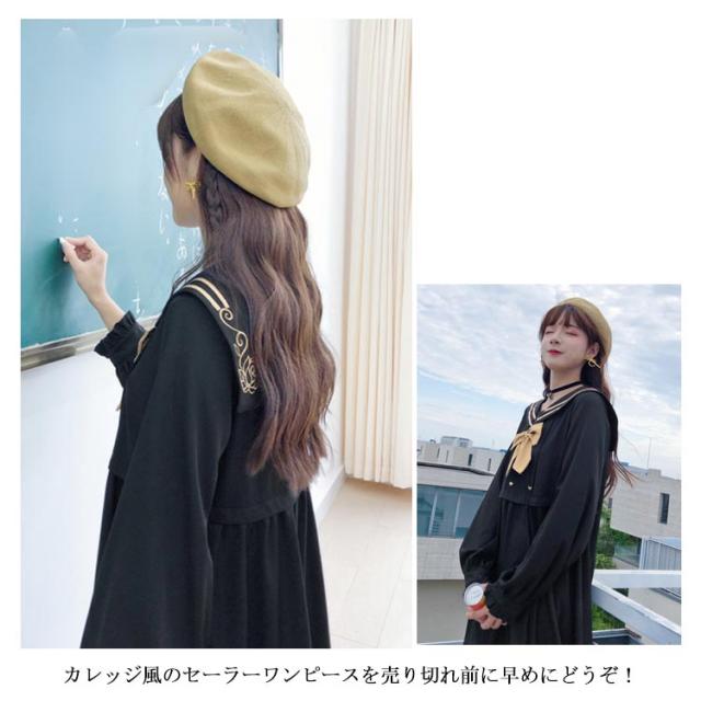 セーラーワンピース バックローズ刺繍 ワンピース セーラーカラー 長袖ワンピース セーラー襟 Aライン ゆったり 可愛い コスプレ 森ガール服