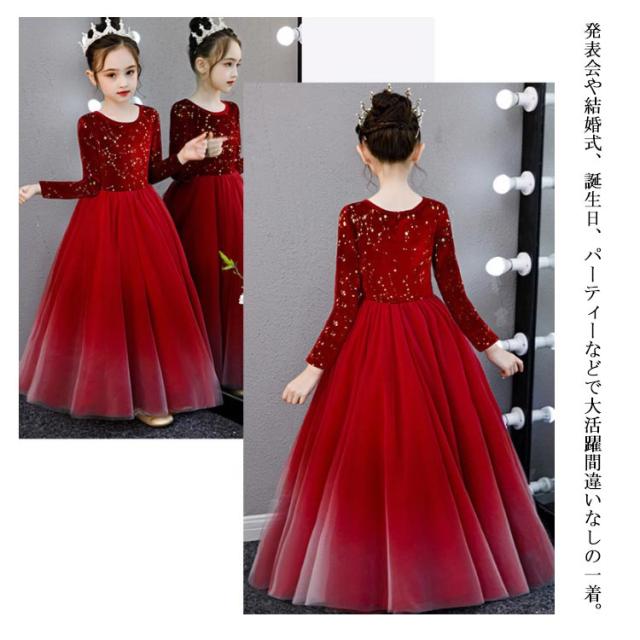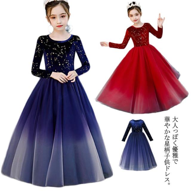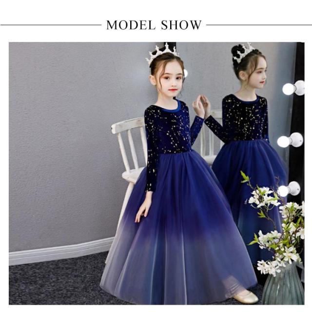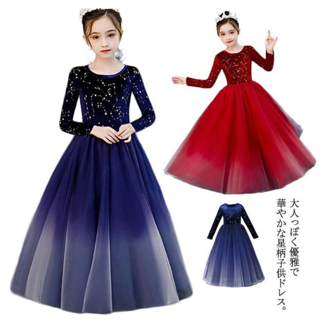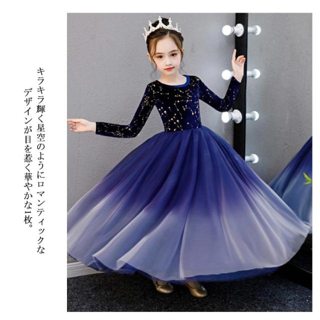 ドレス キッズ 子供ドレス 長袖 ベロア キラキラ ラメ グリッター グラデーション ワンピース 星柄 子供服 マキシ丈 ロング丈 ピアノ発表会 結婚式 パーティー コンクール 舞台 衣装 チュール フォーマル ジュニアドレス