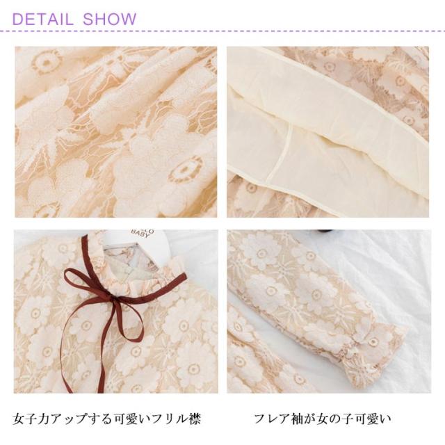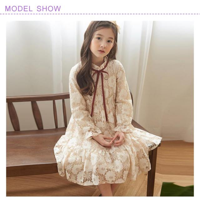 | 繊細な花柄レースが女の子可愛い。 上品でお姫様総レースドレス。 結婚式お呼ばれや発表会、面接、パーティーなどフォーマルシーンに♪ 襟ぐりの配色リボンがスタイリッシュアップ。 ソフトで柔らかいコットンレースを用いり、着心地も最高! デイリーからフォーマルまで使えるヘビロテアイテムです。 | |