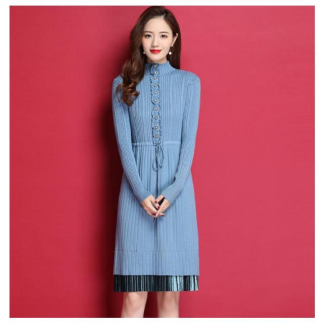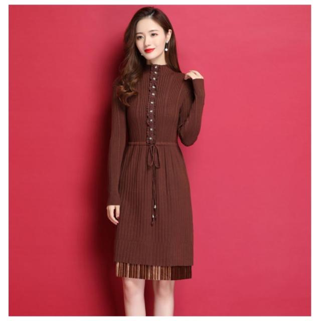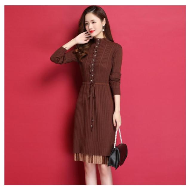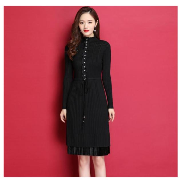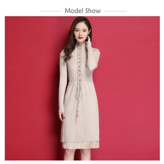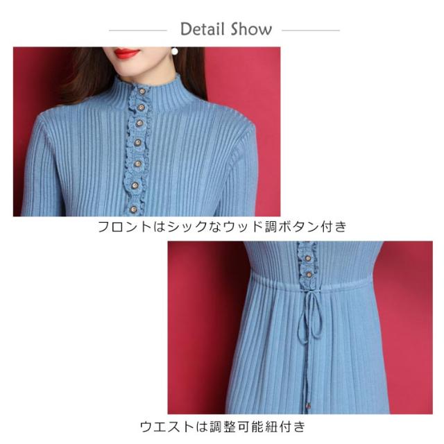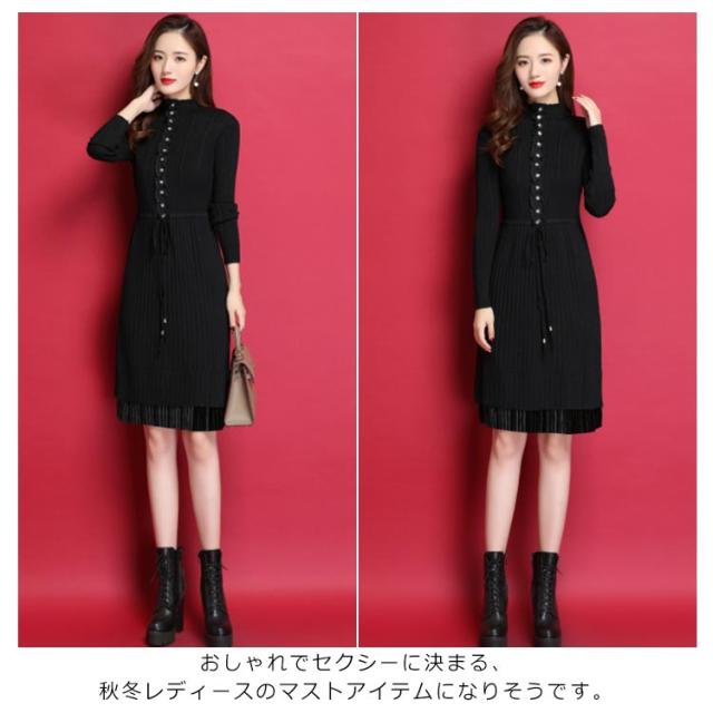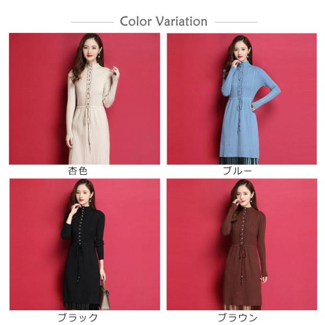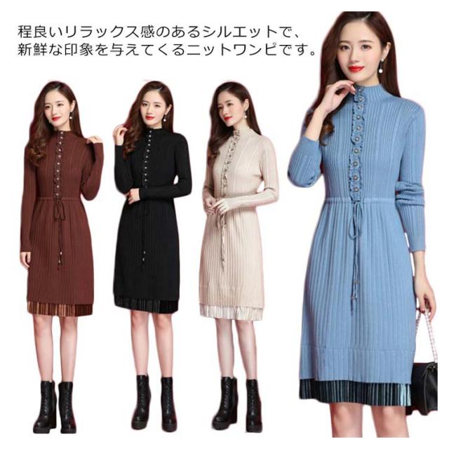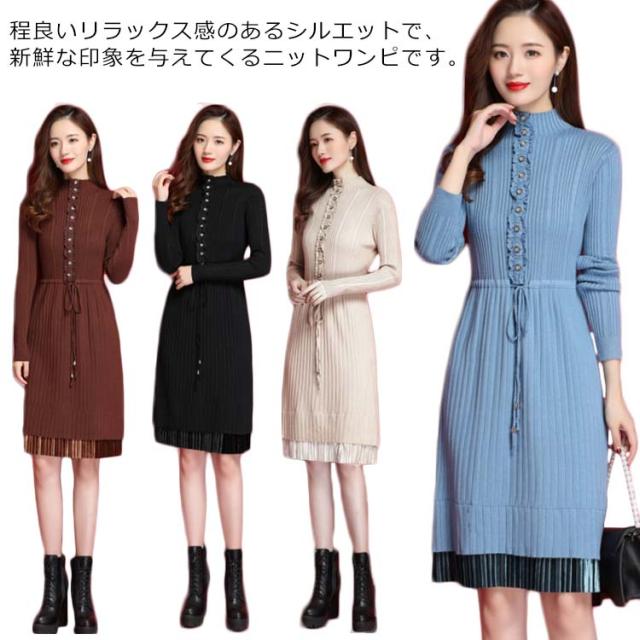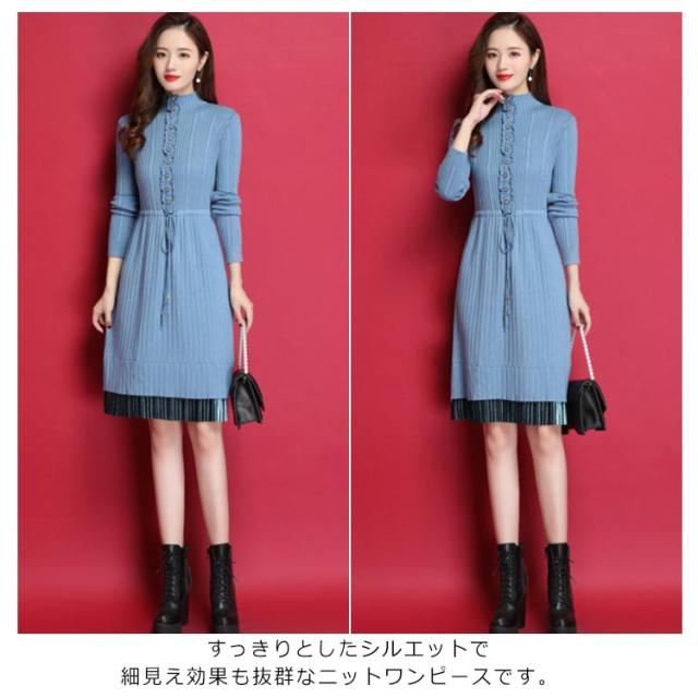 ニットワンピース ハイネックネック 膝丈 Aラインワンピース ハイウエスト リブニット レディース レース切り替え 秋冬 長袖 無地 セーター おしゃれ きれいめ フェミニン 通勤 デート 新作