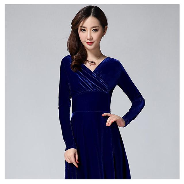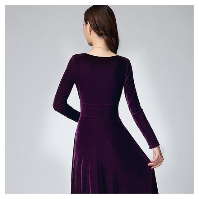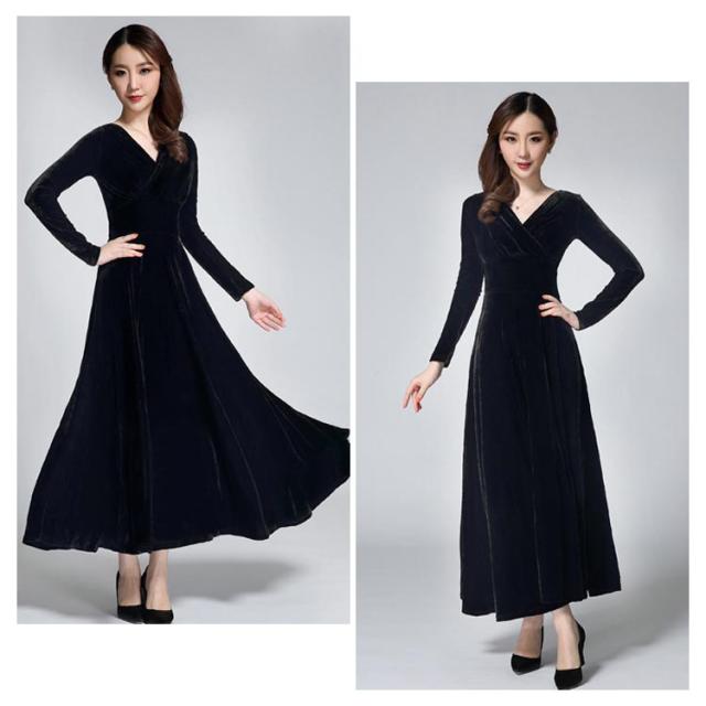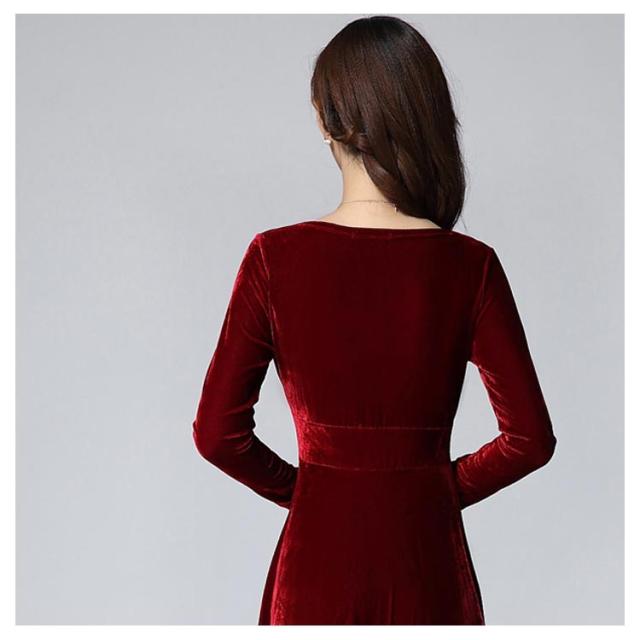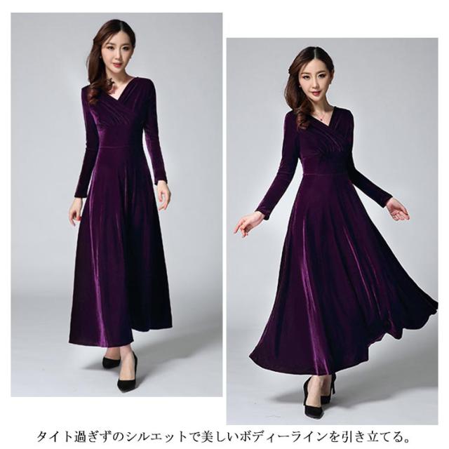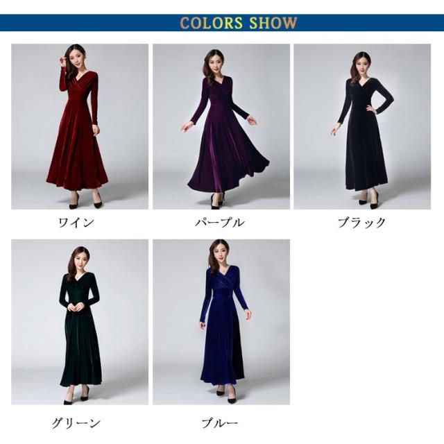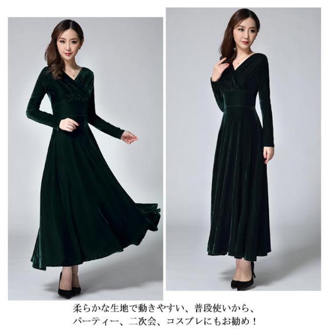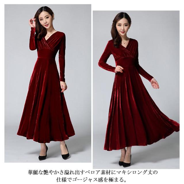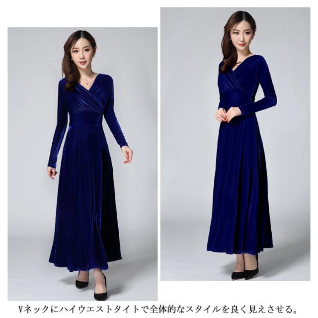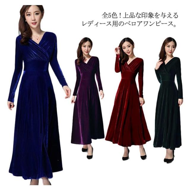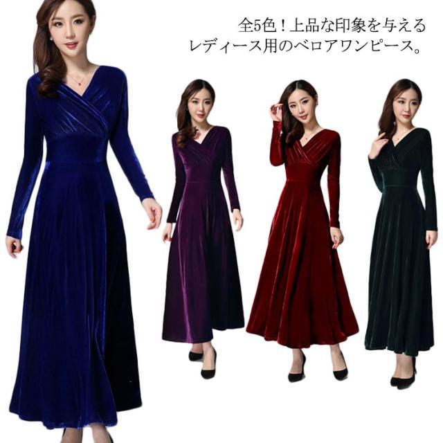 ワンピース ドレス マキシ丈 ベロア Vネック レディース ロングワンピース ハイウエスト 着痩せ 長袖 上品 無地 パーティー 宴会 結婚式 キレイめ お呼ばれ 送料無料