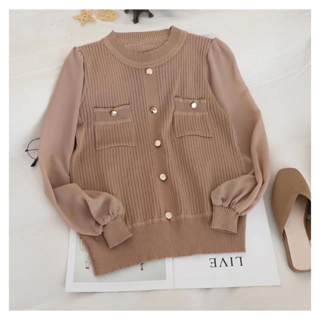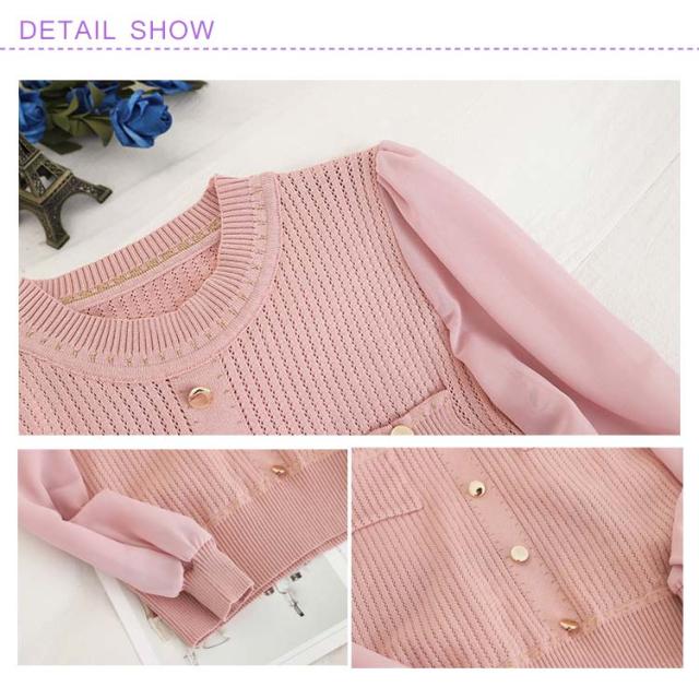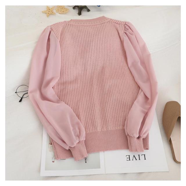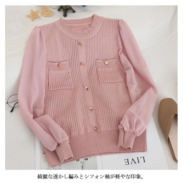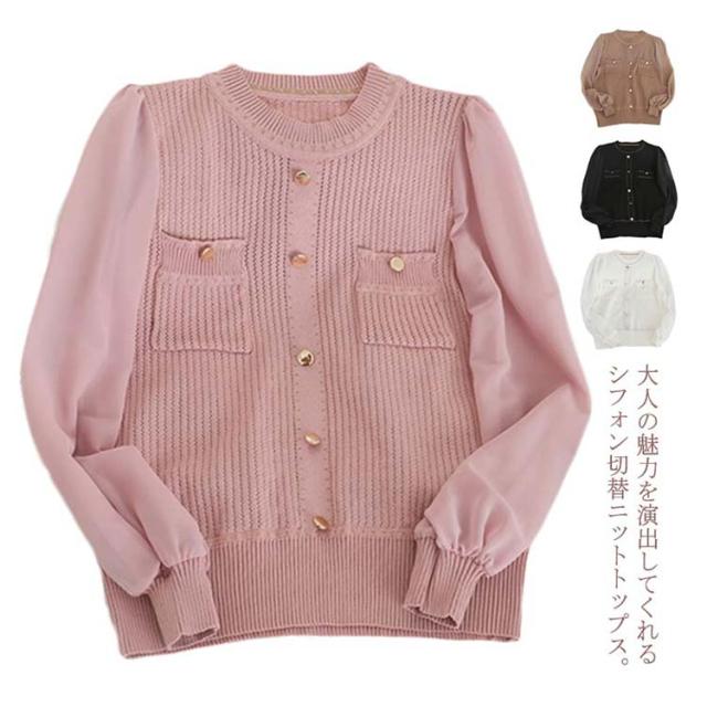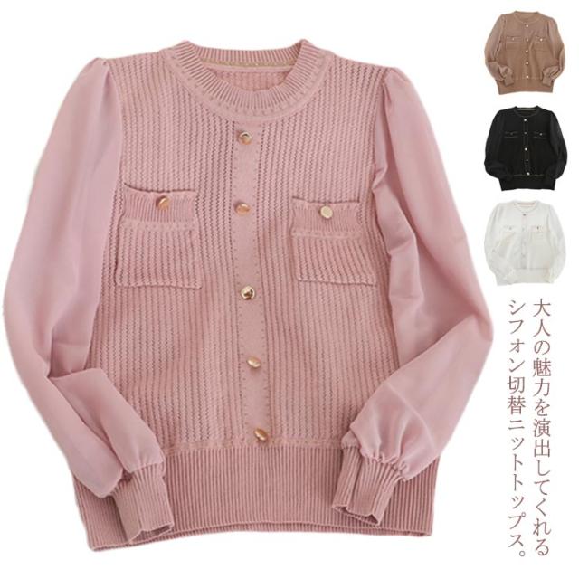 送料無料 ニットトップス ニットセーター レディース 長袖 セーター シフォン切替 透かし編み ニット トップス ラウンドネック ガーリー オシャレ 秋 冬 OL オフィス