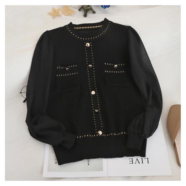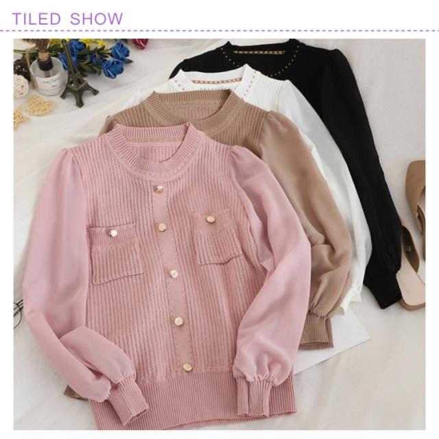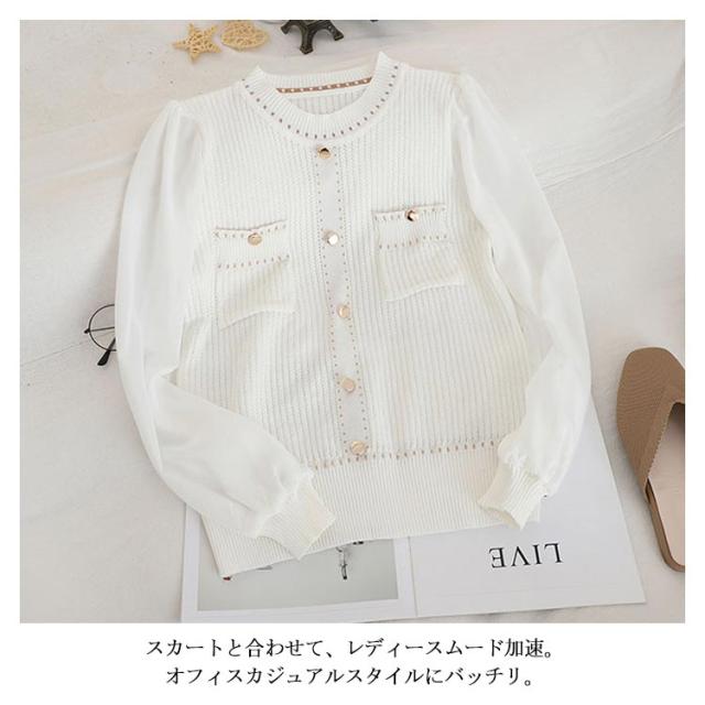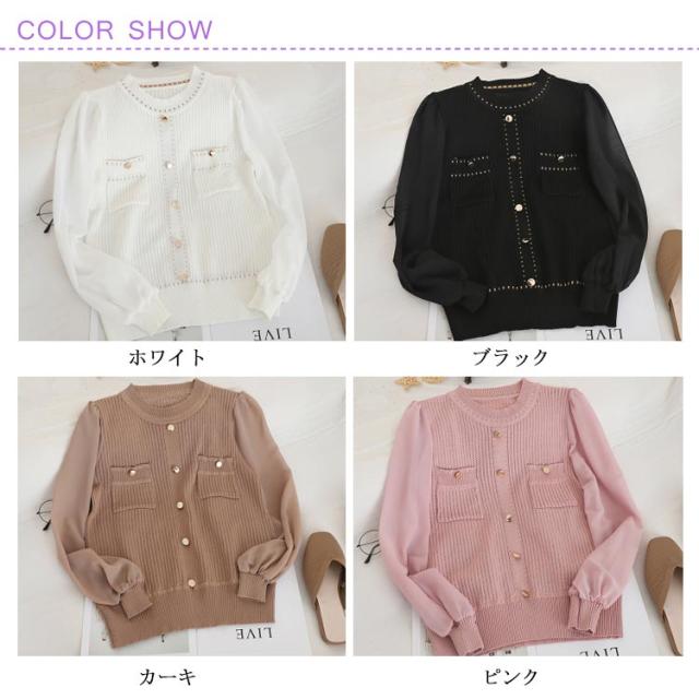| 大人の魅力を演出してくれるシフォン切替ニットトップス。 綺麗な透かし編みとシフォン袖が軽やな印象。 スカートと合わせて、レディースムード加速。オフィスカジュアルスタイルにバッチリ。 | |