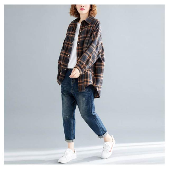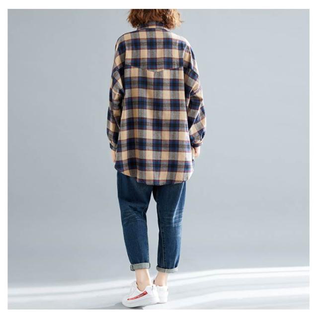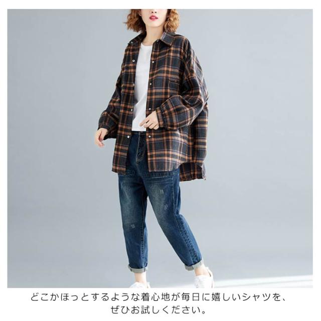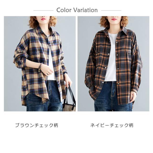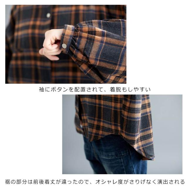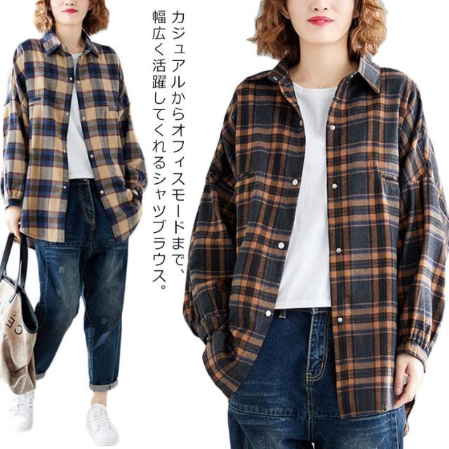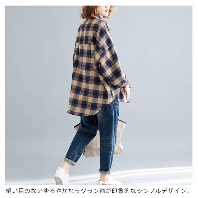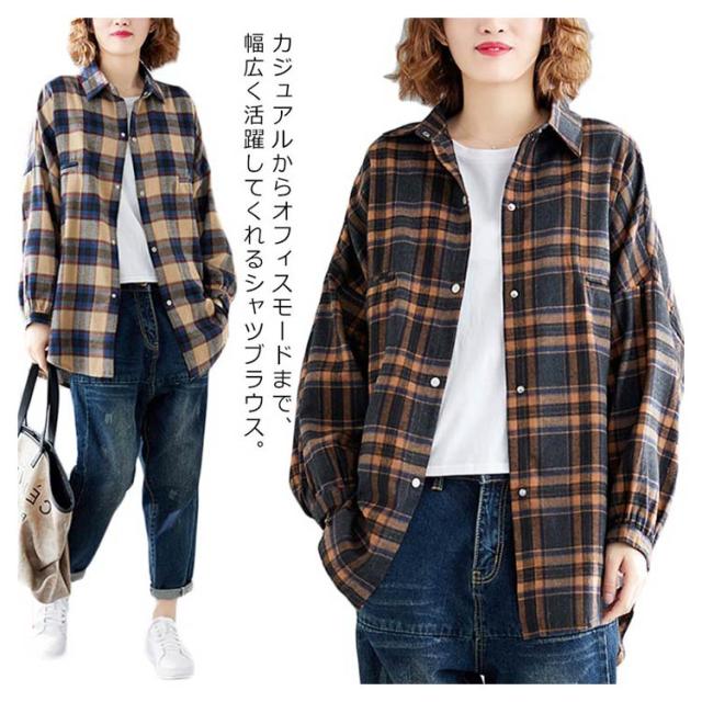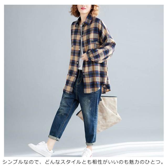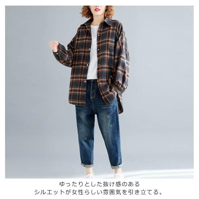 シャツブラウス レディース チェック柄 綿麻シャツ とろみシャツ ライトアウター 春秋アウター 体型カバー 着痩せ ビッグシルエット 大きいサイズ カジュアル