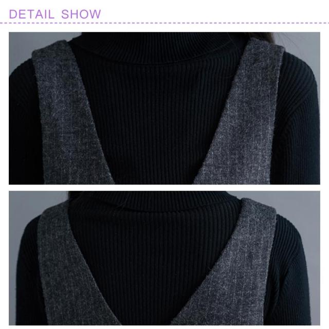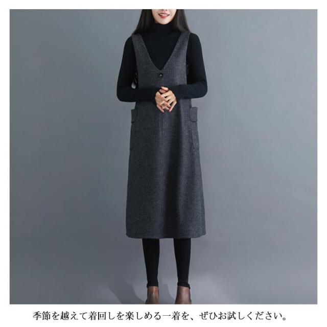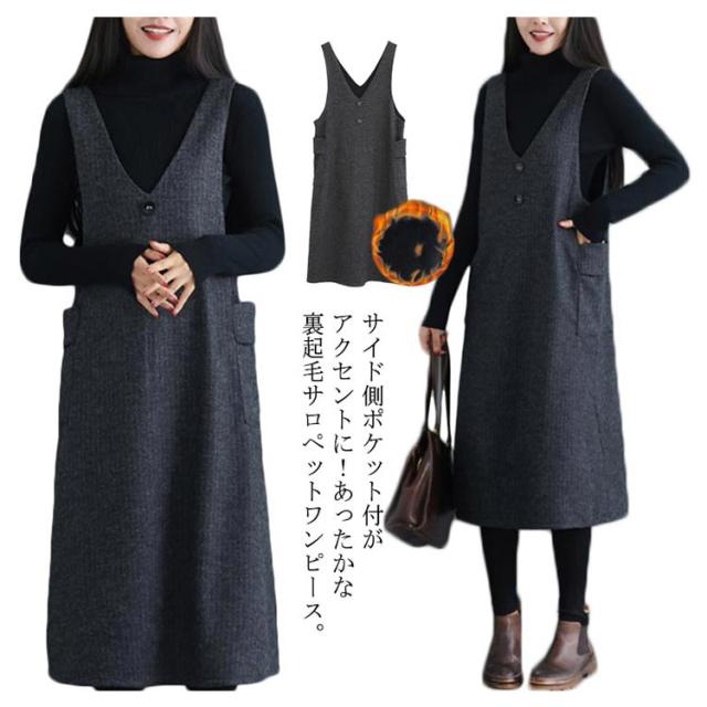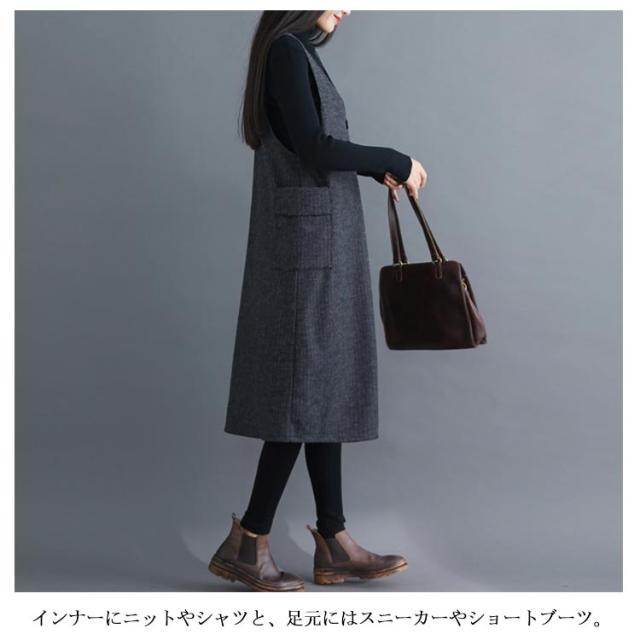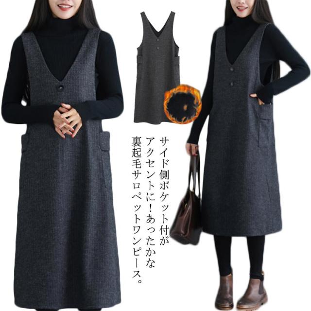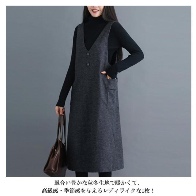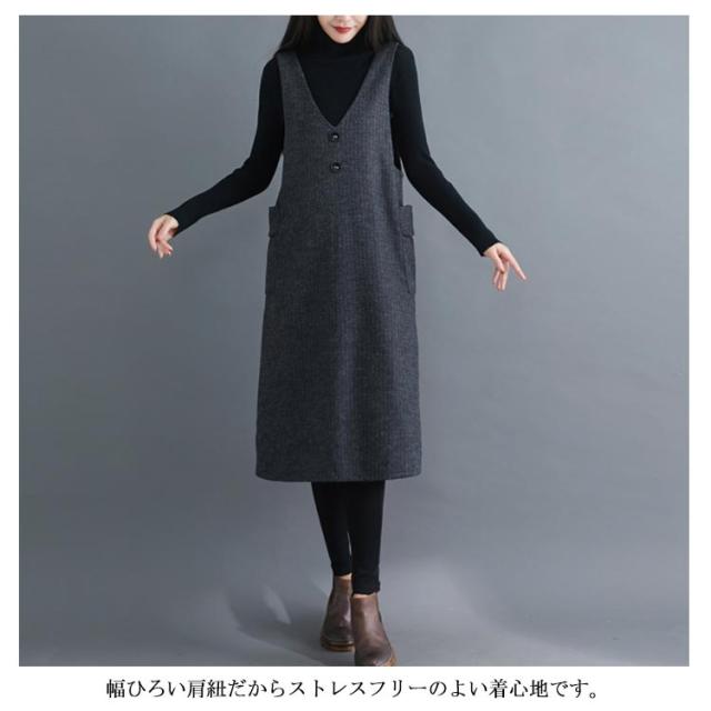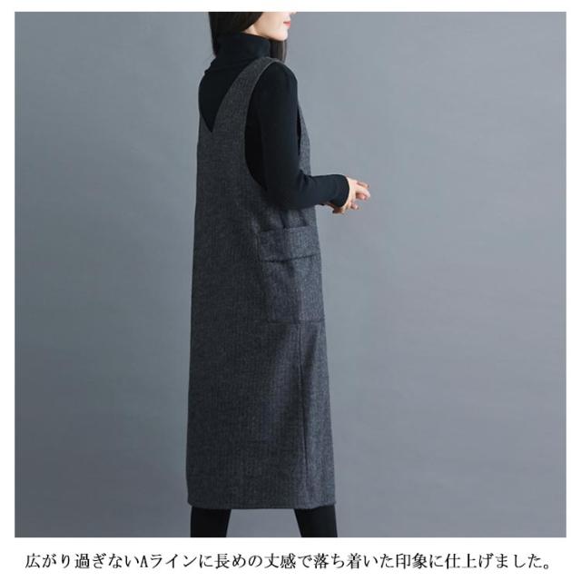 サイド側ポケット付がアクセントに ストライプ柄ワンピース サロペットワンピース ワンピース ノースリーブ サロペット ミドル丈 膝下丈 Vネック 秋冬 ゆったり 体型カバー 裏起毛