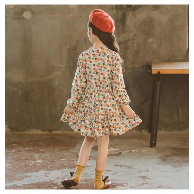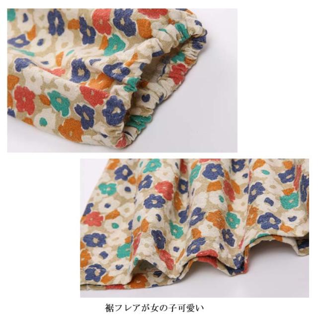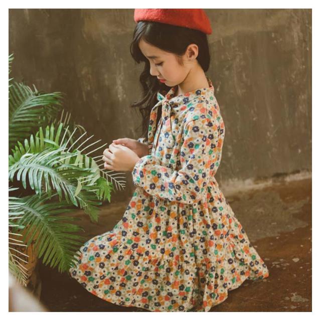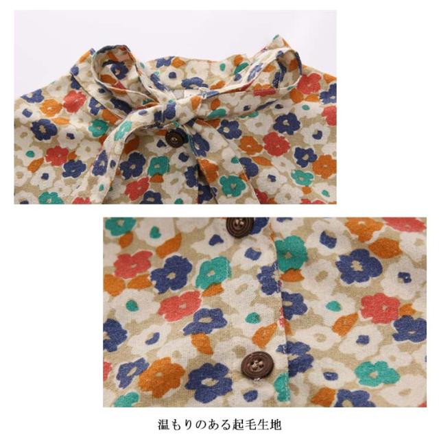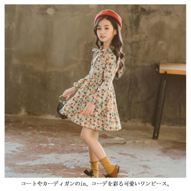 | 彩を添える!女の子可愛い花柄ワンピース。 リボンタイデザインが綺麗な首元を演出し、上品な印象。 お嬢さんのお肌に優しいコットン95%の起毛生地で快適な着心地。 コートやカーディガンのin、コーデを彩る可愛いワンピース。 | |