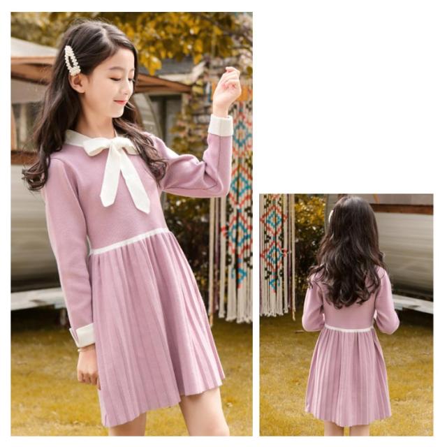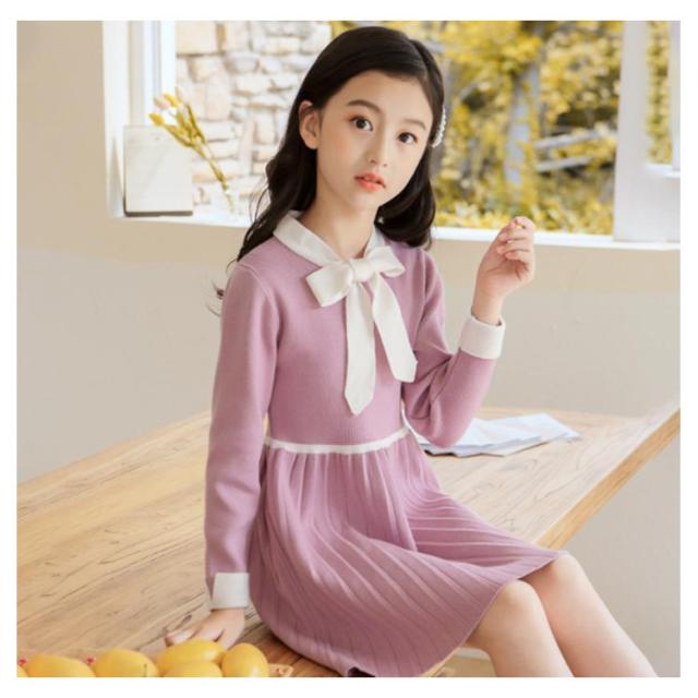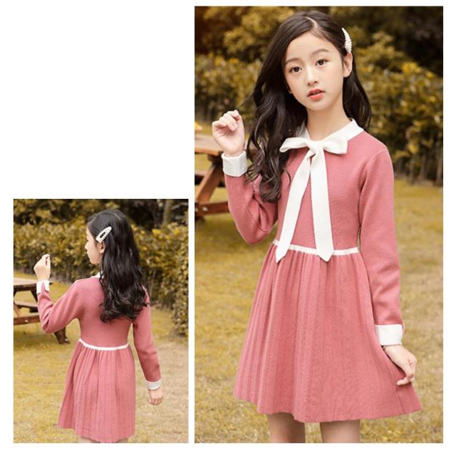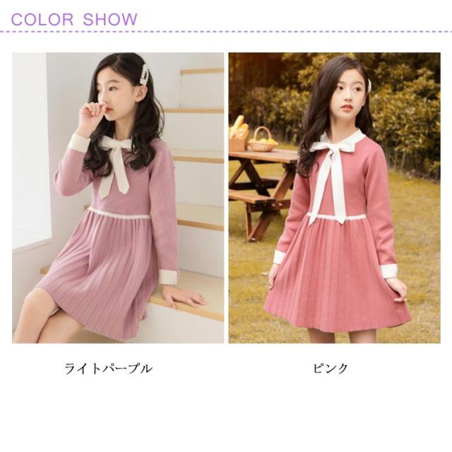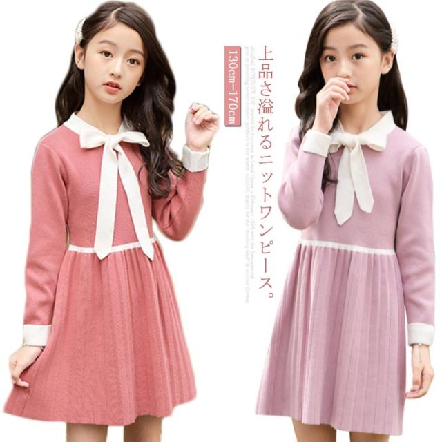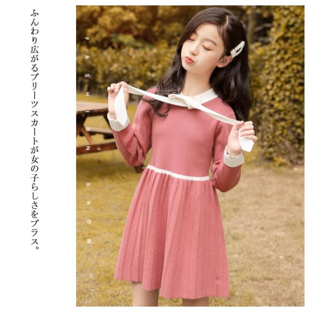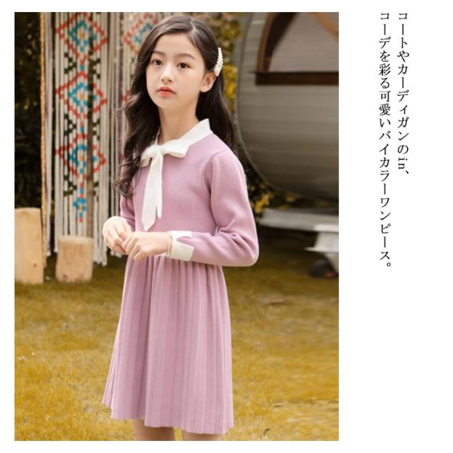 姫系 ニットワンピース ジュニア 子供 ワンピース 長袖 ニット リボンタイ リボン バイカラー 配色 プリーツ プリンセス 女の子 キッズ 子供服 通学 通園 お出かけ 結婚式 パーティー 130 140 150 160 170