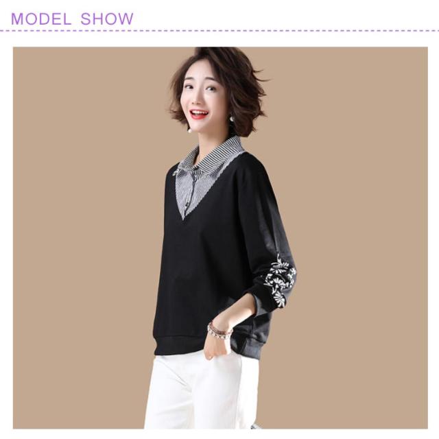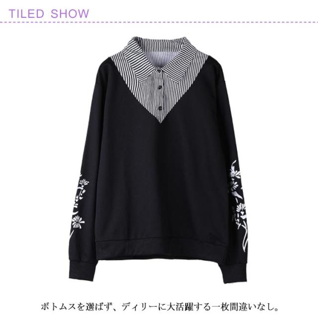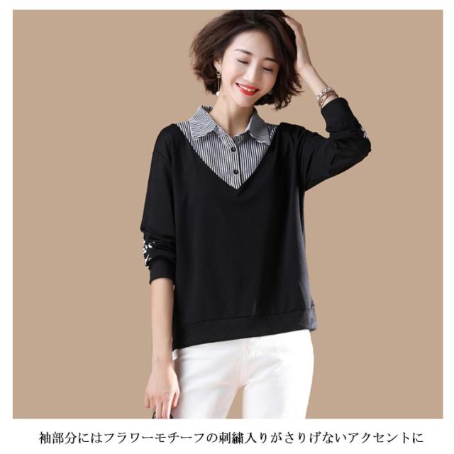 L-5XLサイズ!フェイクセット トレーナー パーカー レディース 重ね着風トレーナー トップス プルオーバー ストライプ 花柄 長袖 カジュアル レイヤード 春服 秋服 大きサイズ