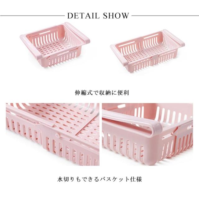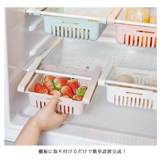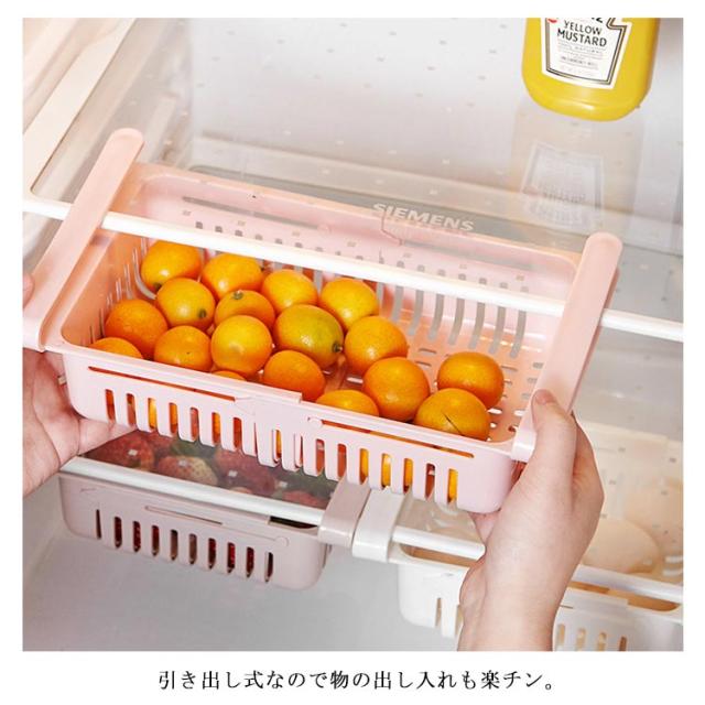 | 伸縮できる冷蔵庫用トレー。 収納物に合わせてサイズが変更できる伸縮式収納かごがとても便利。 棚板に取り付けるだけで簡単設置完成! 引き出し式なので物の出し入れも楽チン。 わさびなど小物類だけでなく、たまごやフルーツなどもスッキリ収納できる。 テーブルに引っ掛けてリモコン入れなどにも使えて便利の多機能収納バスケットです。 | |