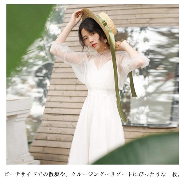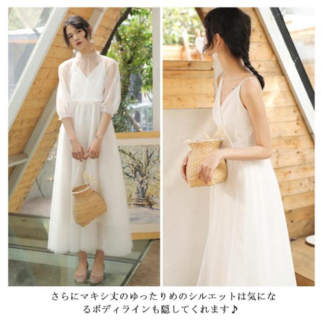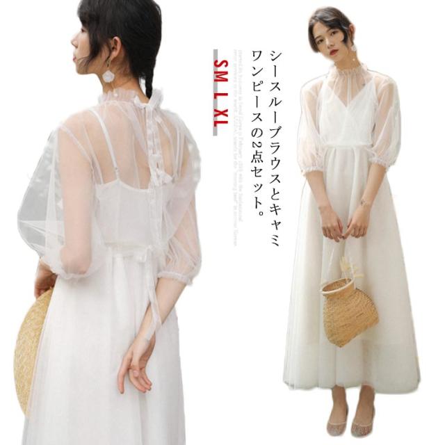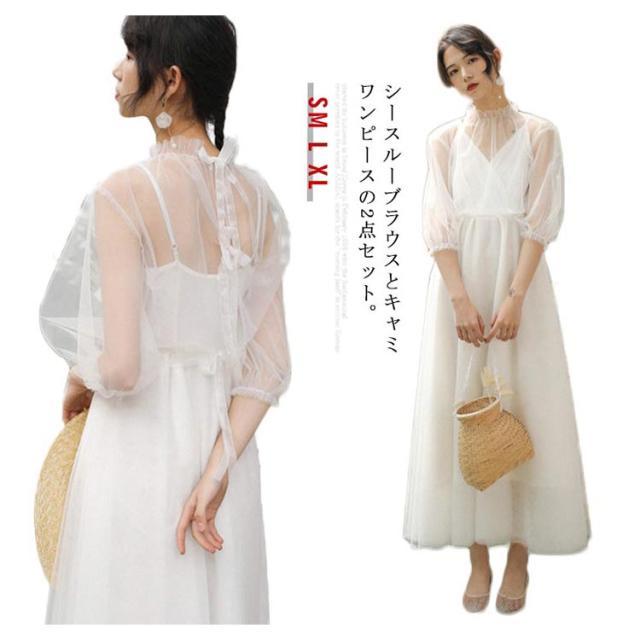 シースルーブラウス付き!キャミソールワンピース ロング ワンピース リゾートワンピース 白ワンピース ロング マキシ ノースリーブ vネック