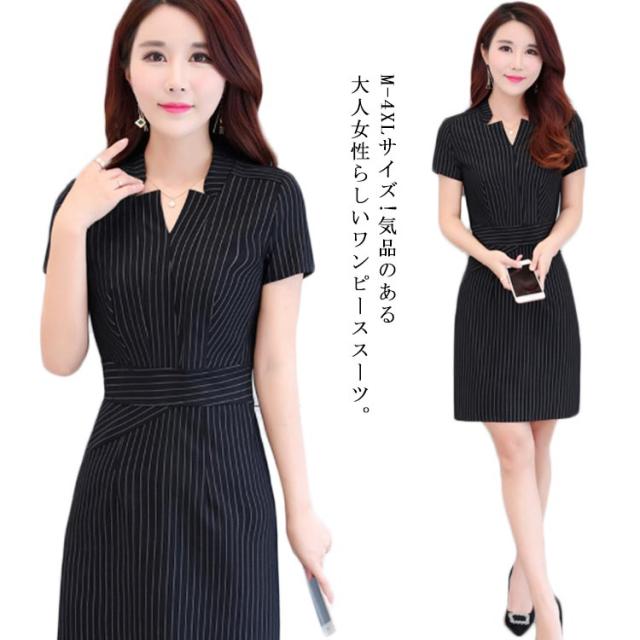 M-4XLサイズ!フォーマルワンピース ワンピース ワンピーススーツ 夏 半袖ワンピース ストライプ vネック 通勤 OL ビジネス フォーマル 大きサイズ
