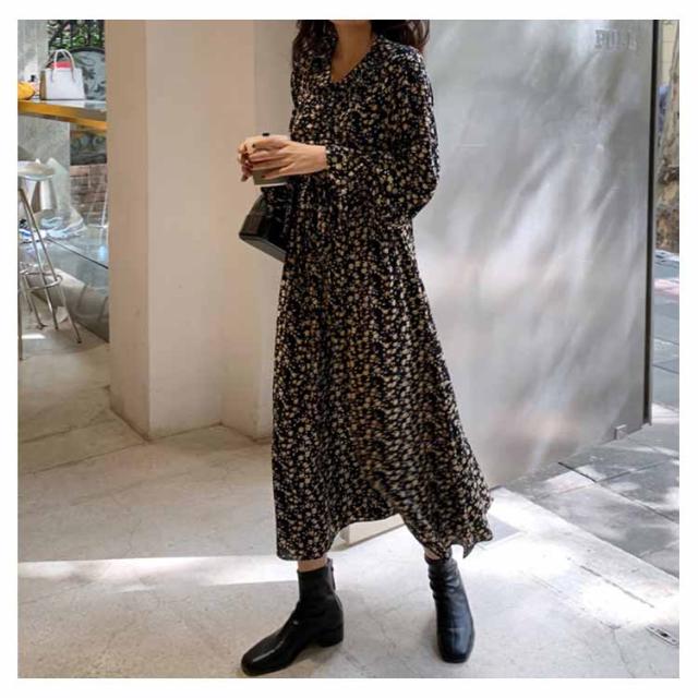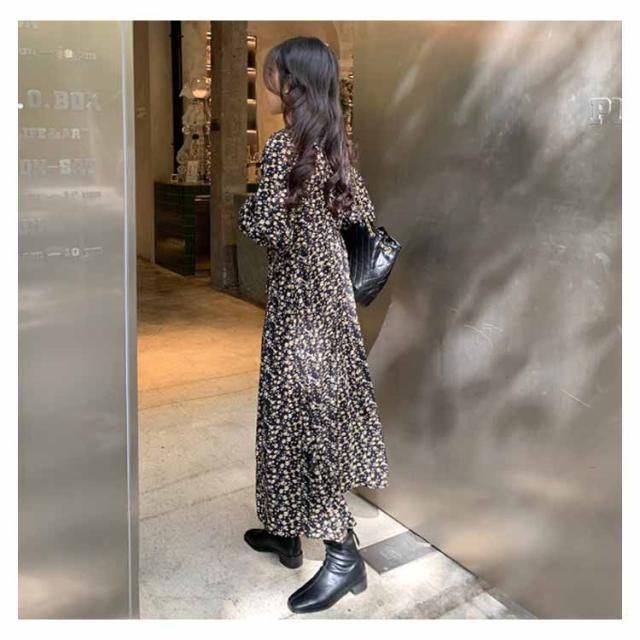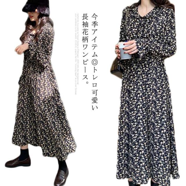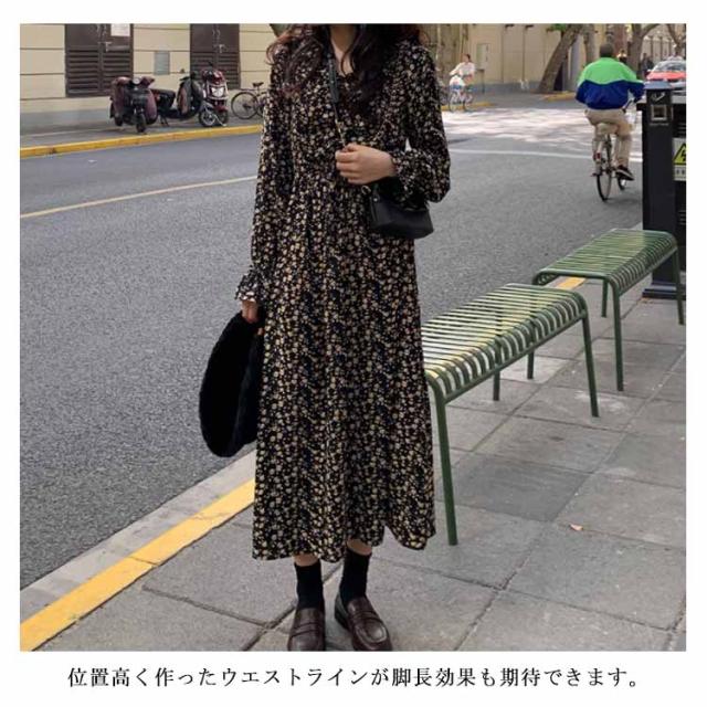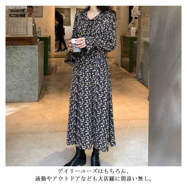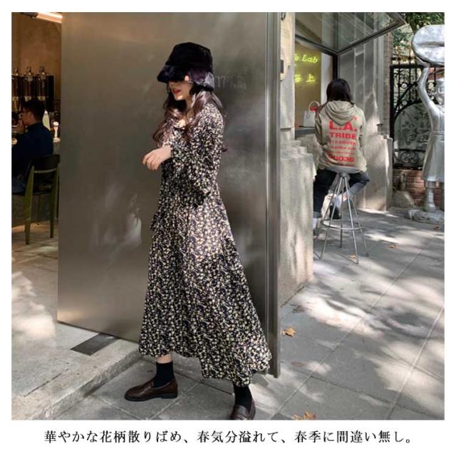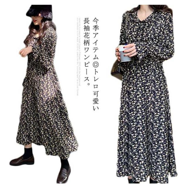 ワンピース ロングワンピース レディース 長袖 花柄 シフォン ミモレ丈 カジュアル キレイめ 春物 体型カバー 韓国ファション