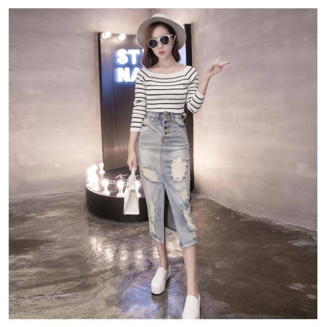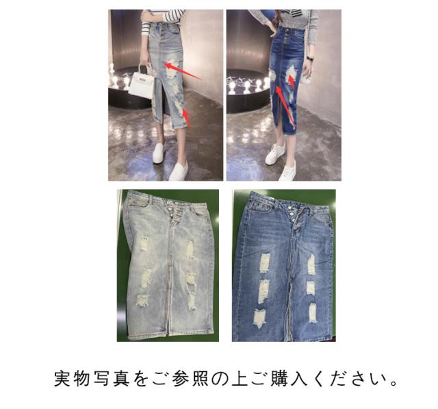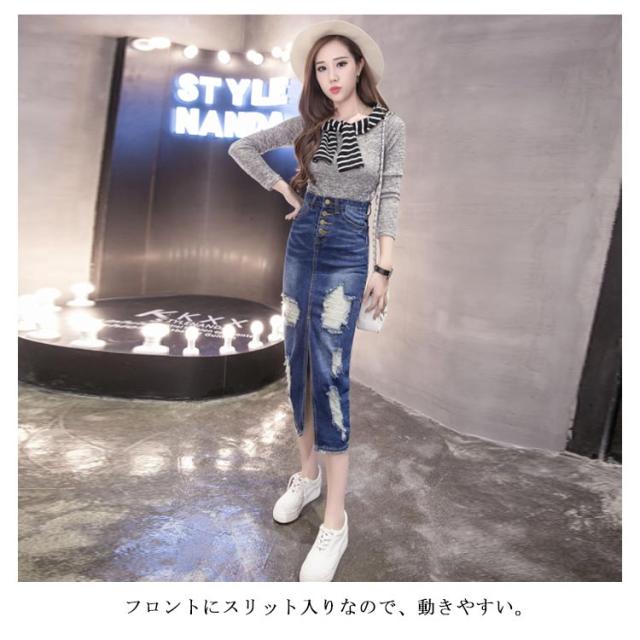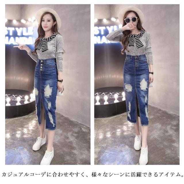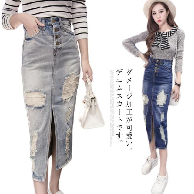 デニムスカート ロングスカート ダメージ加工 スリット入り スリム ハイウエスト レディース ロング丈 スカート ミモレ丈 韓国風 ファッション 細見え 脚長効果 大きいサイズ