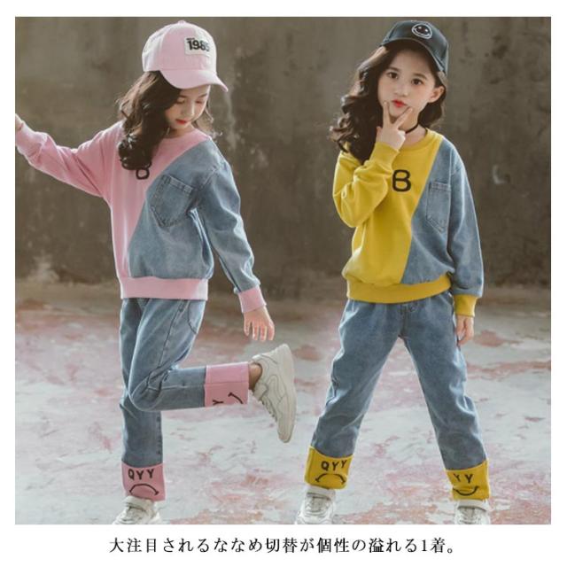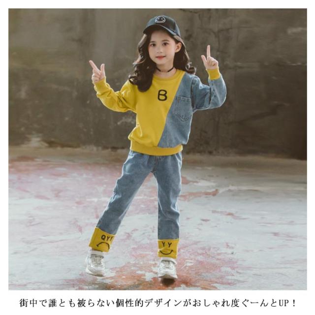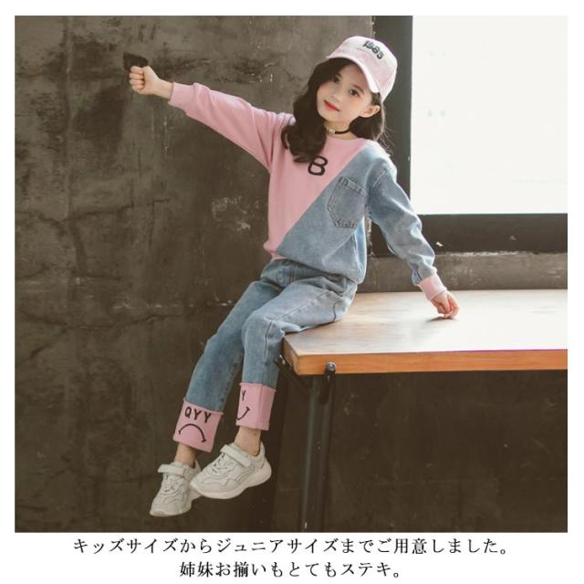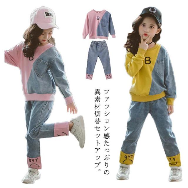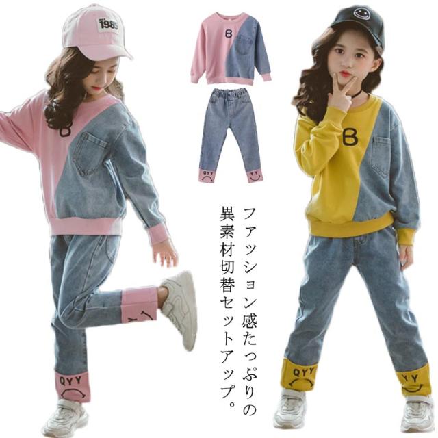 キッズ 異素材切替 デニム トレーナー デニムパンツ スウェット セットアップ ジャージ バイカラー 子供服 女の子 110 120 130 140 150 160 男の子 スポーツ パーカー