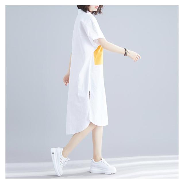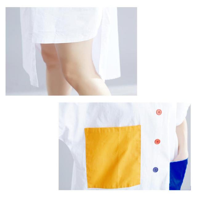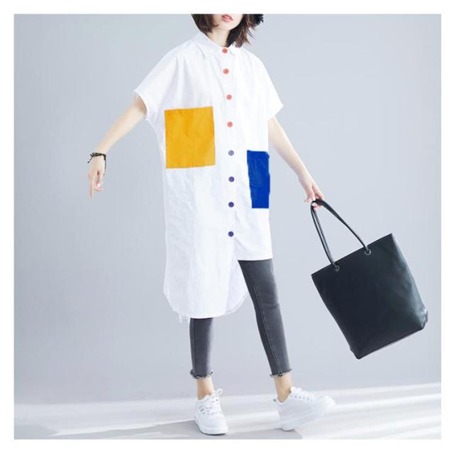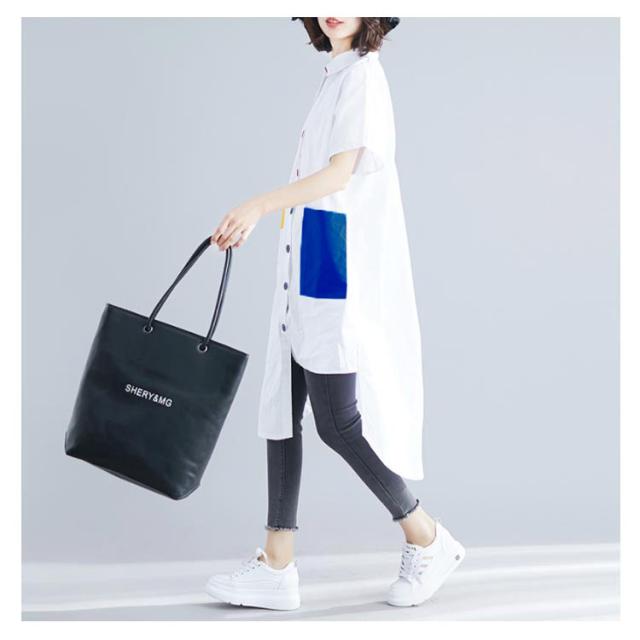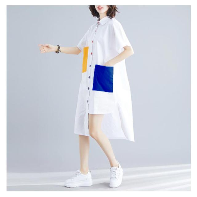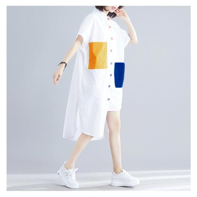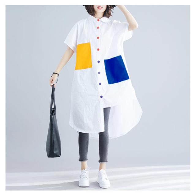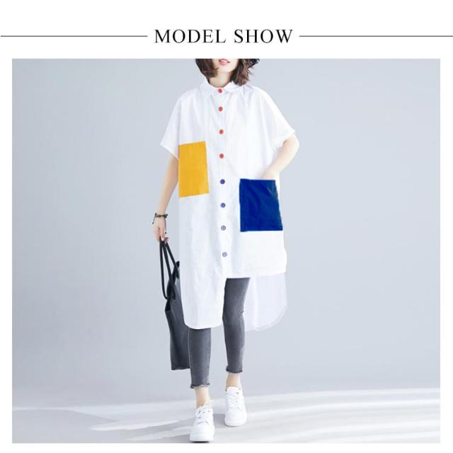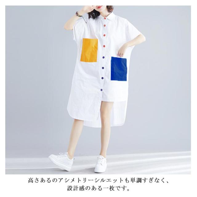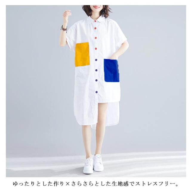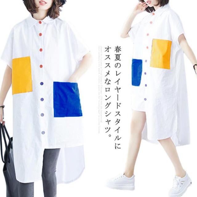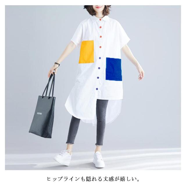シャツ レディース ロングシャツ 配色 アシメトリーシルエット トップス 半袖 カジュアルシャツ 大きサイズ おしゃれ 可愛い 春夏 夏