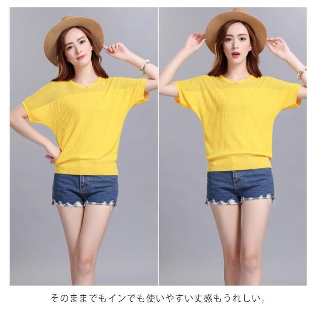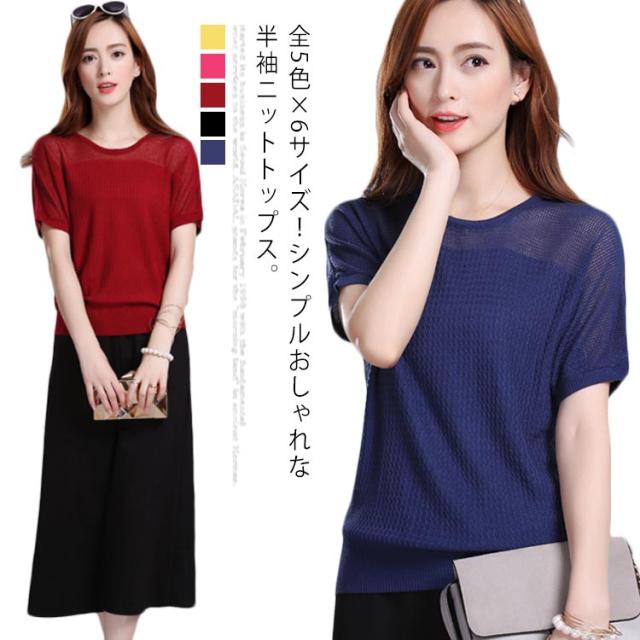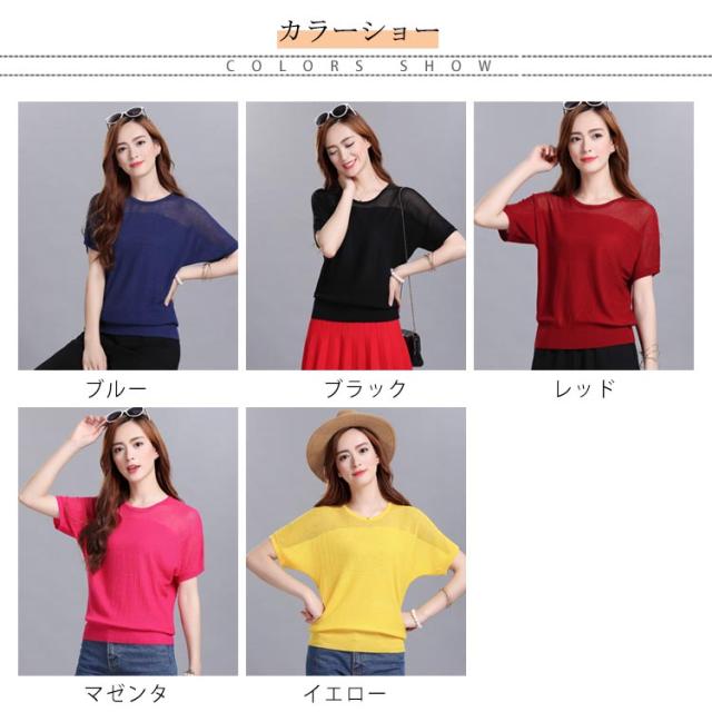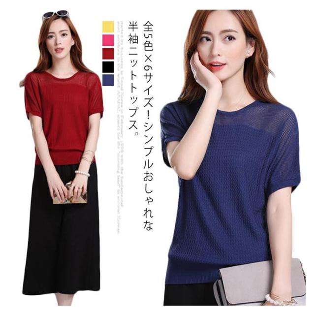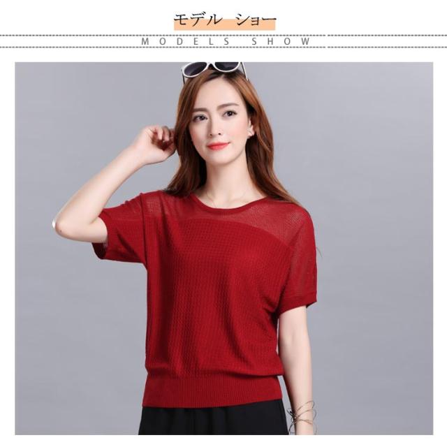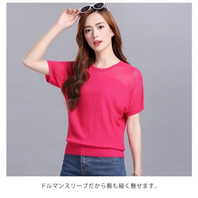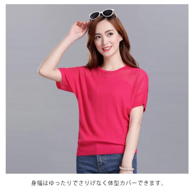 全5色×6サイズ!半袖tシャツ サマーニット ドルマンシルエット シースルーニット ニットトップス 透け編み 半袖ニット 薄手 大きサイズ シンプル 無地 体型カバー ゆったり 可愛い 春 夏 レディース