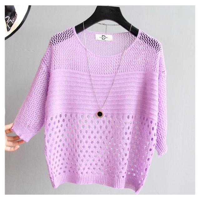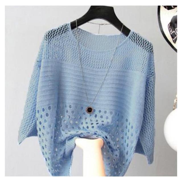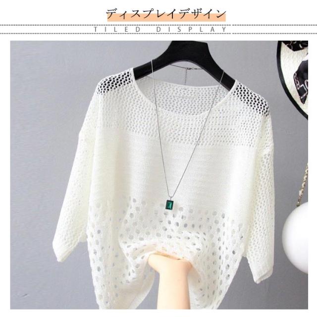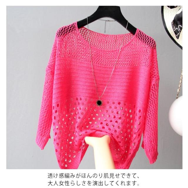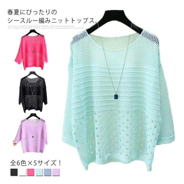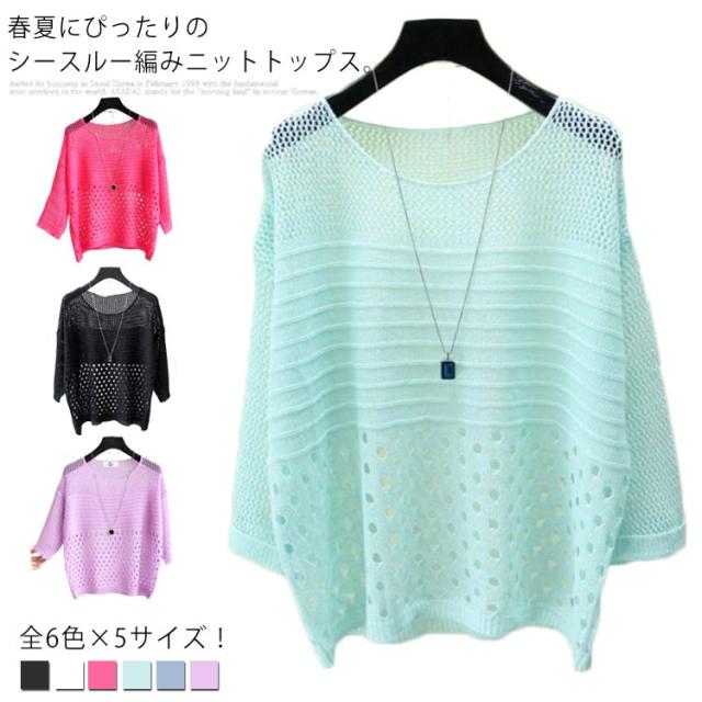全6色×5サイズ!シースルー編みニット 夏 薄手 プルオーバー ニットソー サマーニット 透け編み シースルー ニットトップス クルーネック 日焼け対策 長袖 シンプル 無地 春夏 大きサイズ