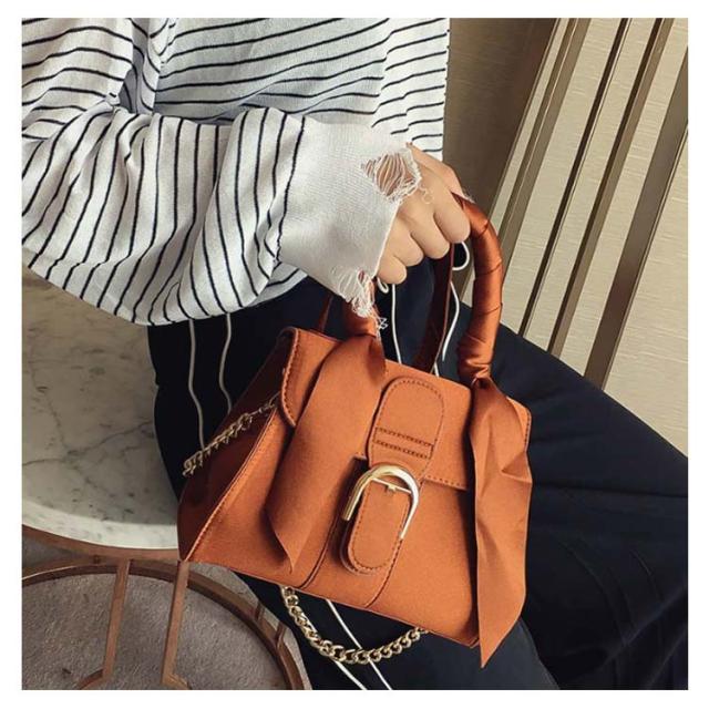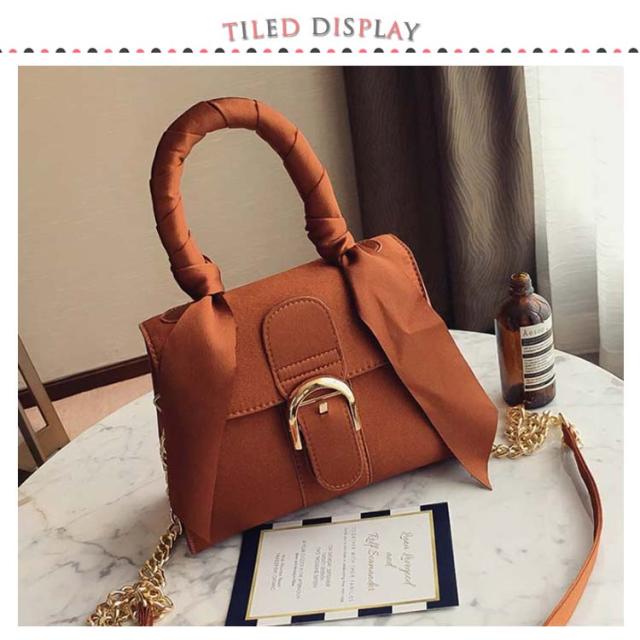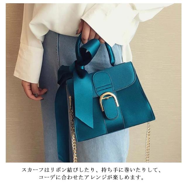 | 絶妙な光沢感のある生地仕立て2WAYバッグ。 キュートな台形がどんなスタイルにも合わせ安い。 スカーフはリボン結びしたり、持ち手に巻いたりして、コーデに合わせたアレンジが楽しめます。 手提げしたり、付属のチェーンを付けて、斜め掛けしたり2WAY使えるデザインも嬉しい。 開閉はマグネット式で、マチ広なので、コンパクトな見た目以上の収納力! | |