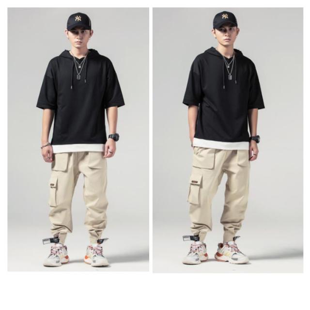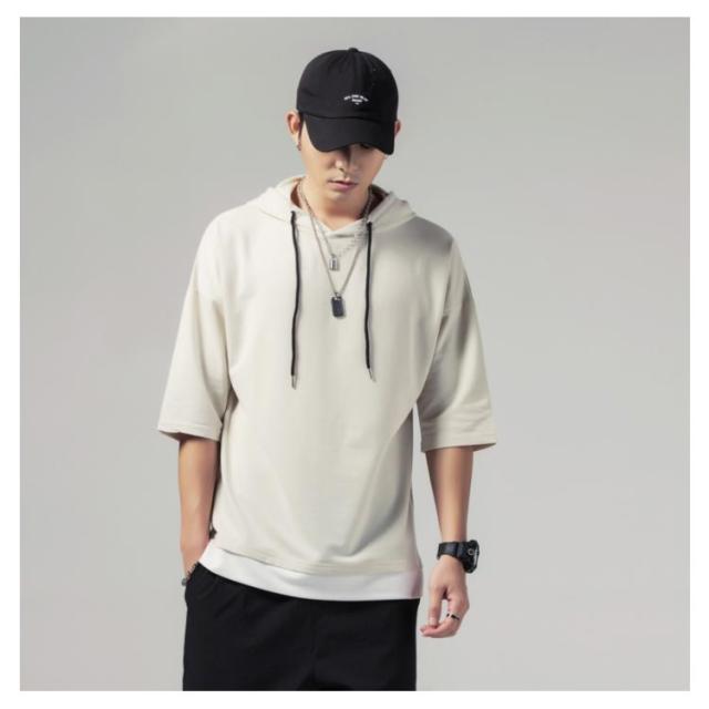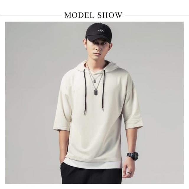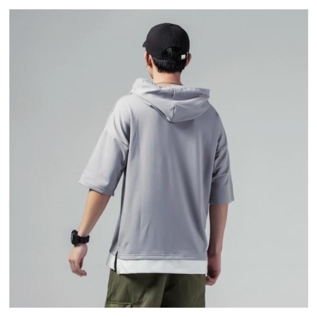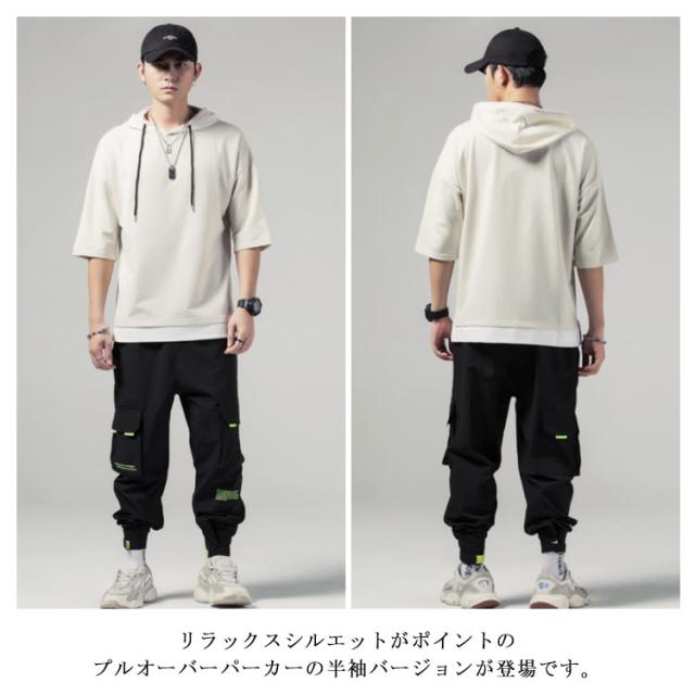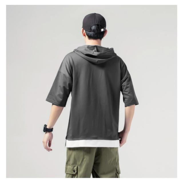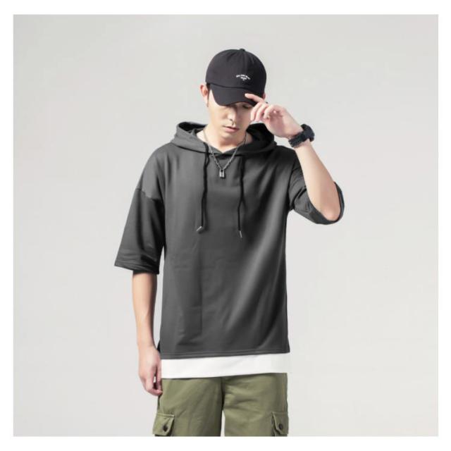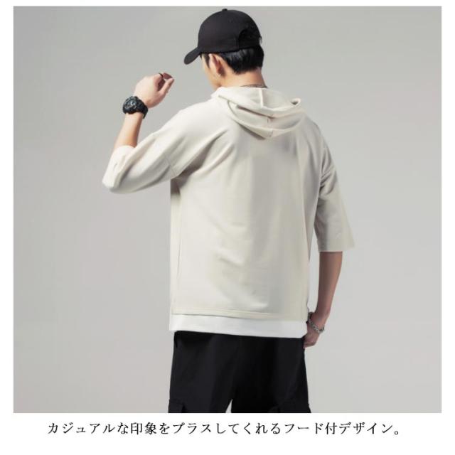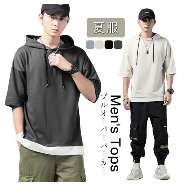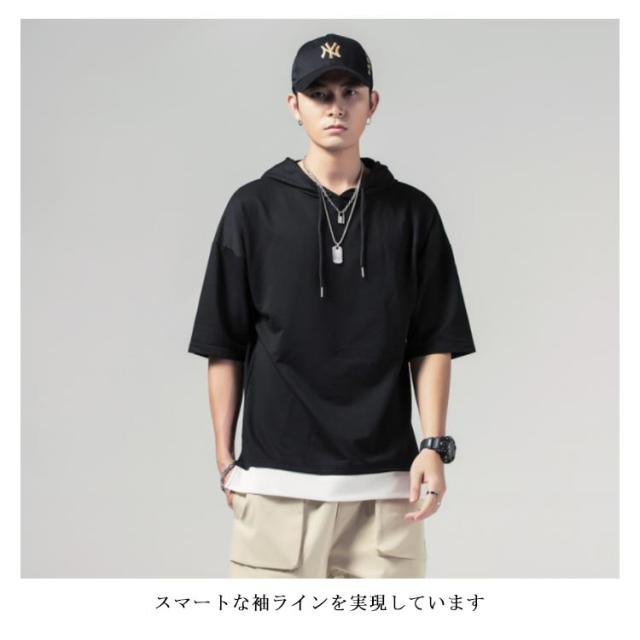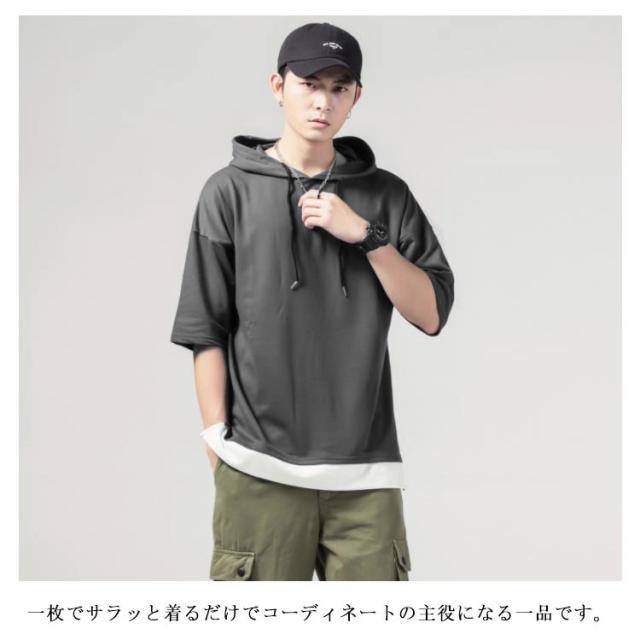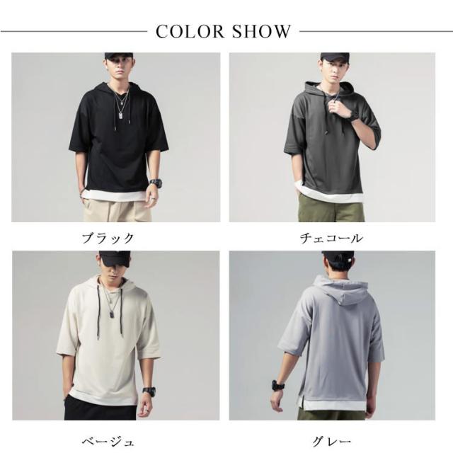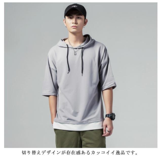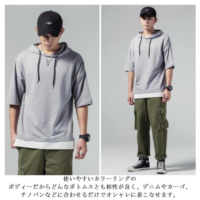 重ね着風 プルオーバーパーカ 半袖 Tシャツ フード付き 半袖 パーカー パーカ プルオーバーパーカー メンズ トップス 半袖Tシャツ レイヤード風 カットソー 薄手 夏男 夏服 夏物 送料無料
