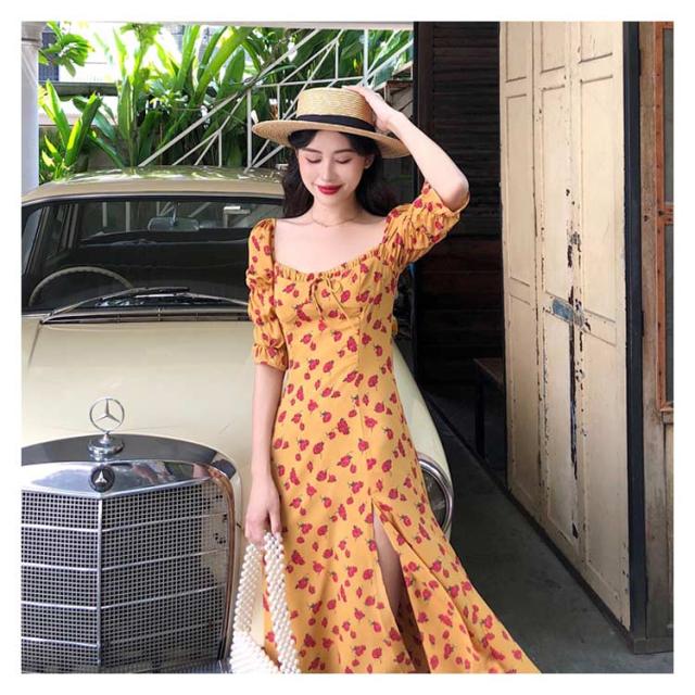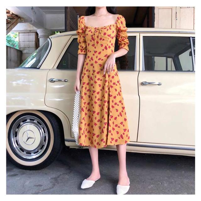 5分袖 ワンピース 花柄 レトロ ヴィンテージ 送料無料 レディース お嬢様 ロングワンピース フレア Aライン 半袖 パフスリーブ オフショルダー スリット ミモレ丈 春夏