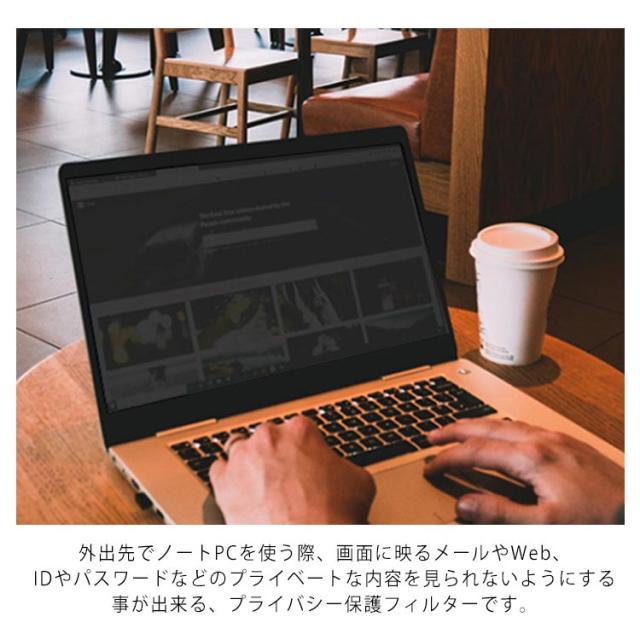 | ノートPC覗き見防止フィルム プライバシーを守る!画面の正面を中心に60°(左右30°)より外の角度からは画面がまっ黒に見えるので、プライバシーを守る! 表面硬度3Hと硬度が高いので、フィルター表面のキズを防止します。また、気になる皮脂汚れやホコリから画面を保護します。 | |