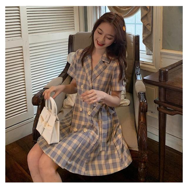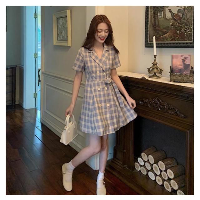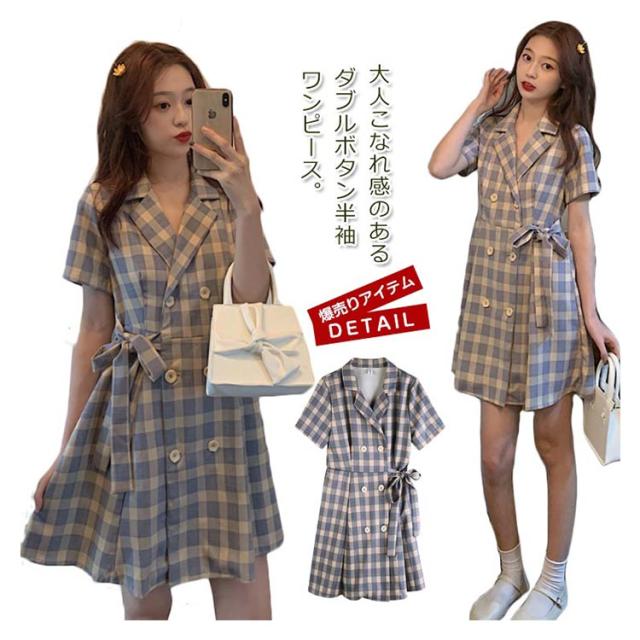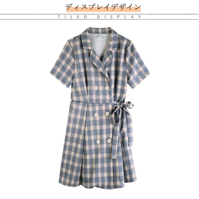 ワンピース 開襟 シャツワンピース ダブルボタン レディース 半袖 ワンピース 送料無料 オープンカラー ショート丈 ウェストリボン トレンチコート風 膝上 チェック柄 春夏