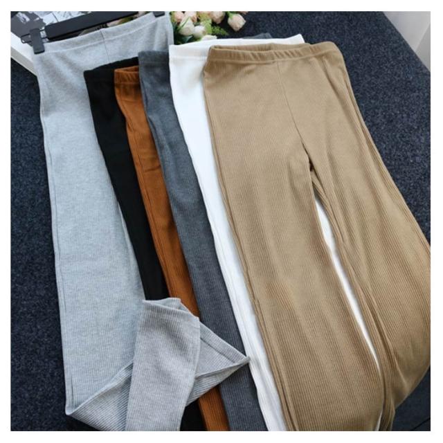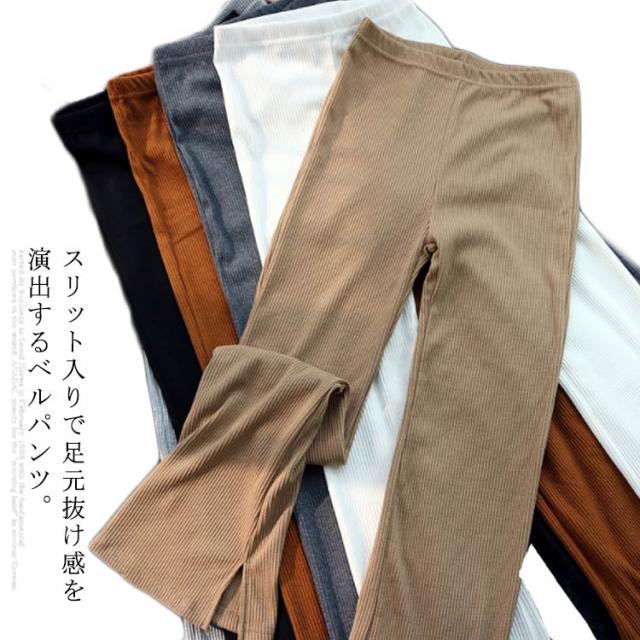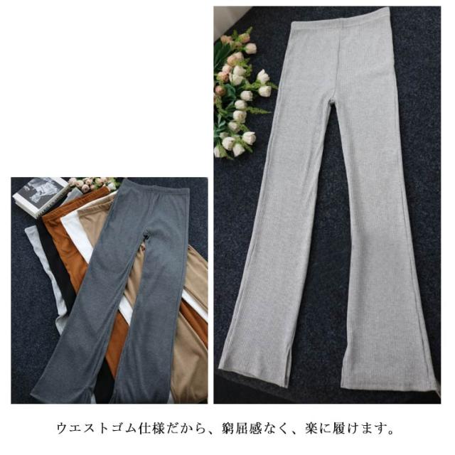 全6色 リブニット スリット パンツ ニットソー ロングパンツ フレアパンツ 送料無料 レディース ウェストゴム ストレッチ イージーパンツ ベルボトム 無地