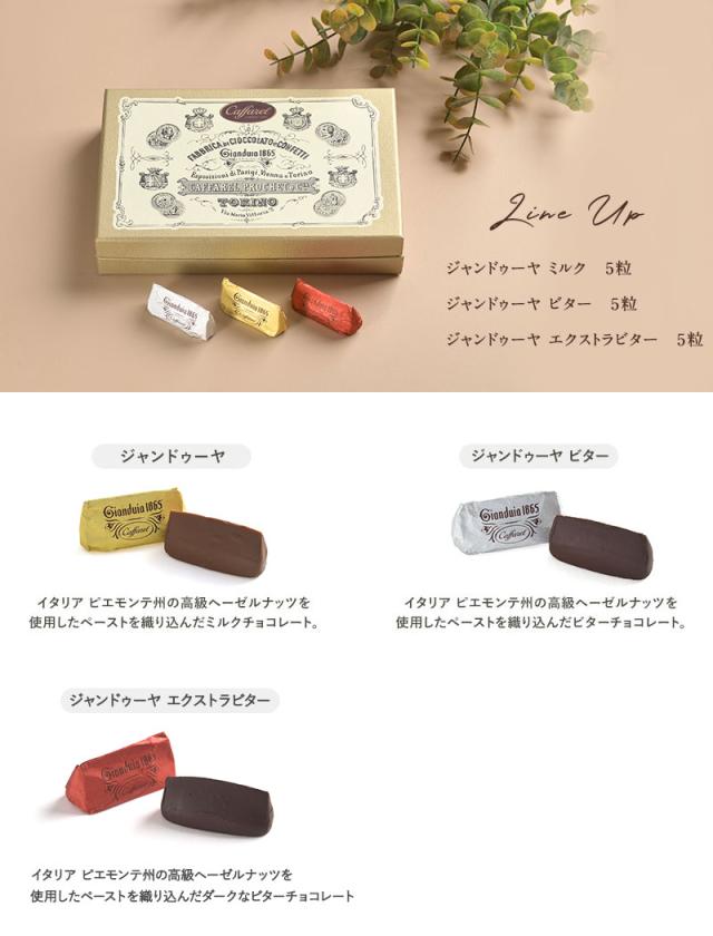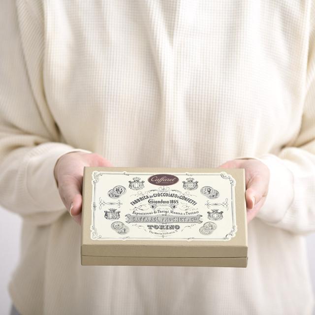 イタリア王室が愛するチョコレートで、贅沢なひと時を。イタリアで190年以上の歴史を誇るチョコレートブランド、Caffarel(カファレル)のジャンドゥーヤ詰め合わせボックスです。クラシックなデザインのボックスに、カファレルの代名詞である「ジャンドゥーヤ」を2種類、合計15粒詰め合わせました。