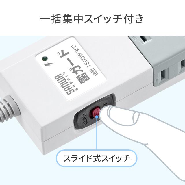 ※一度接続した機器をタップから外し、1500W以下になるように機器を取り除き、ブレーカー内蔵一括集中スイッチをスライドし、OFF・ONして再度お使いください。