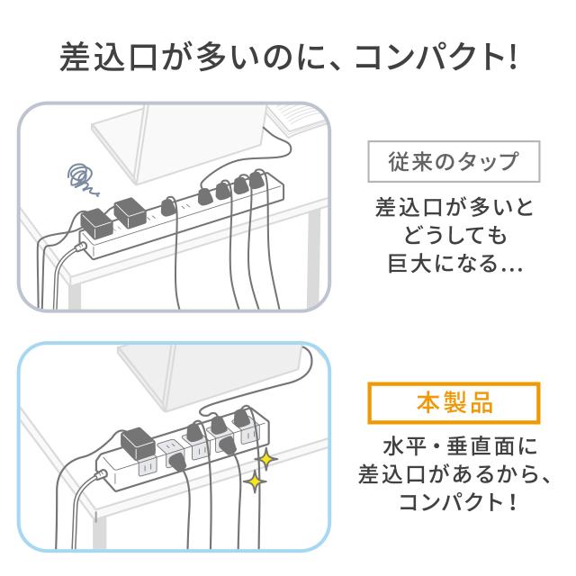 ●正面・側面にプラグを差せる設計で、従来の長い10個口タップよりコンパクトなボディを実現しました。