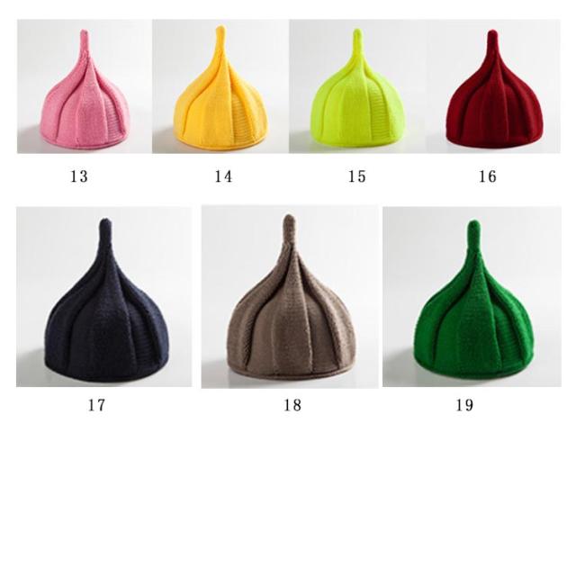 | 可愛いとんがりニット帽子の登場です。 カラー豊富な19色*男女兼用のデザインが魅力。 くるくるねじっことんがりデザインがかぶるだけで存在感アップ。 よく伸びるニット素材なので乳児から幼児まで幅広く使っていただけます。 兄弟お揃い、色違いでかぶるのもオススメです。プレゼントにも喜ばれます。 | |
