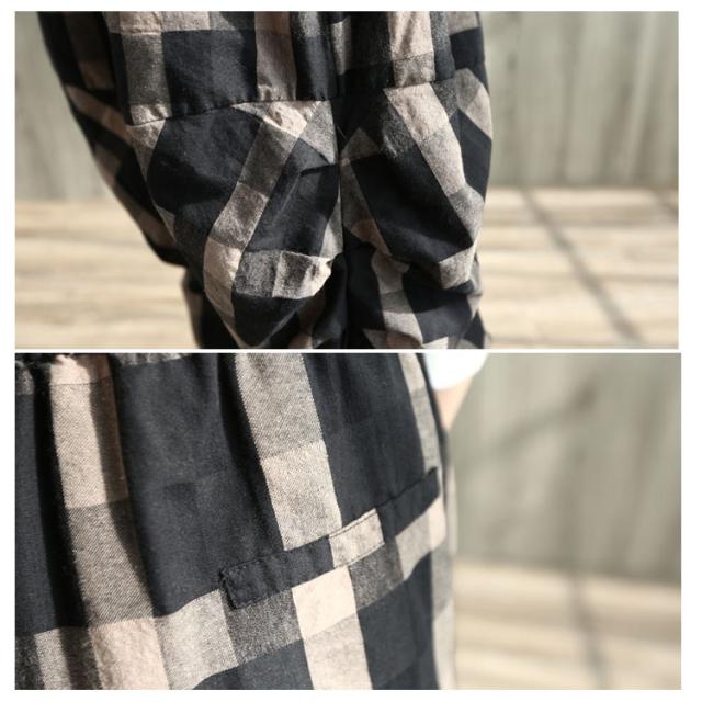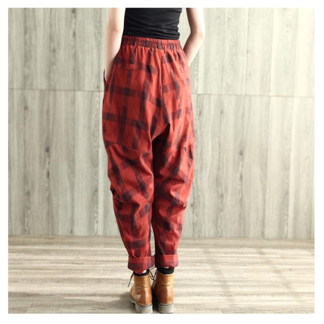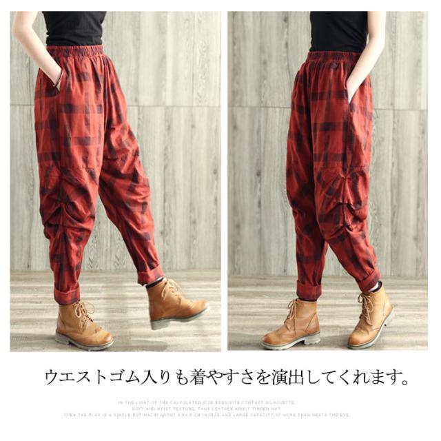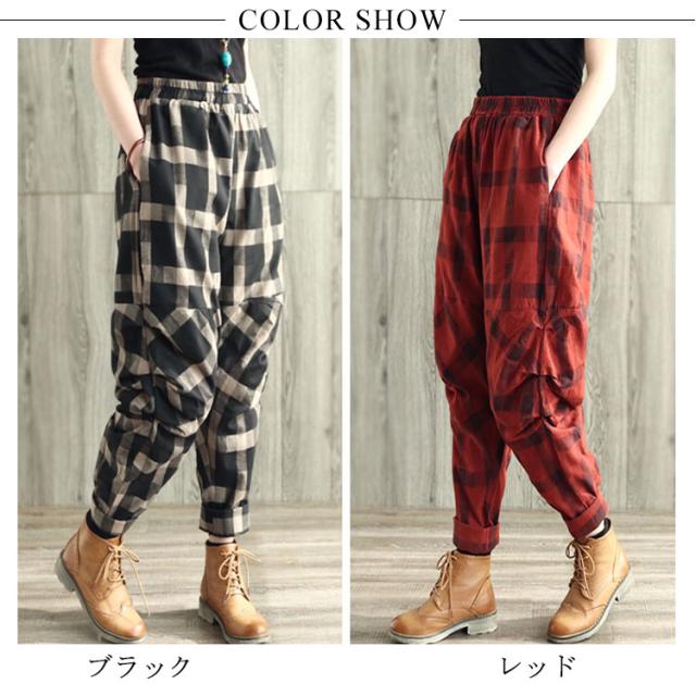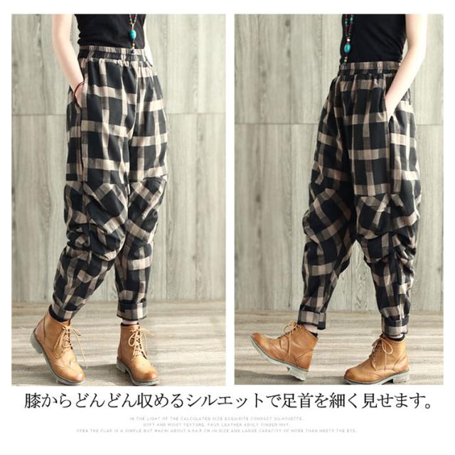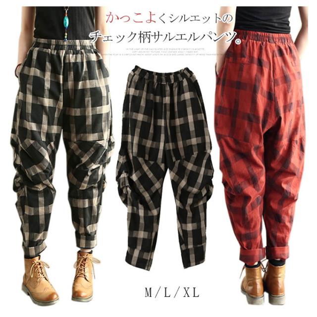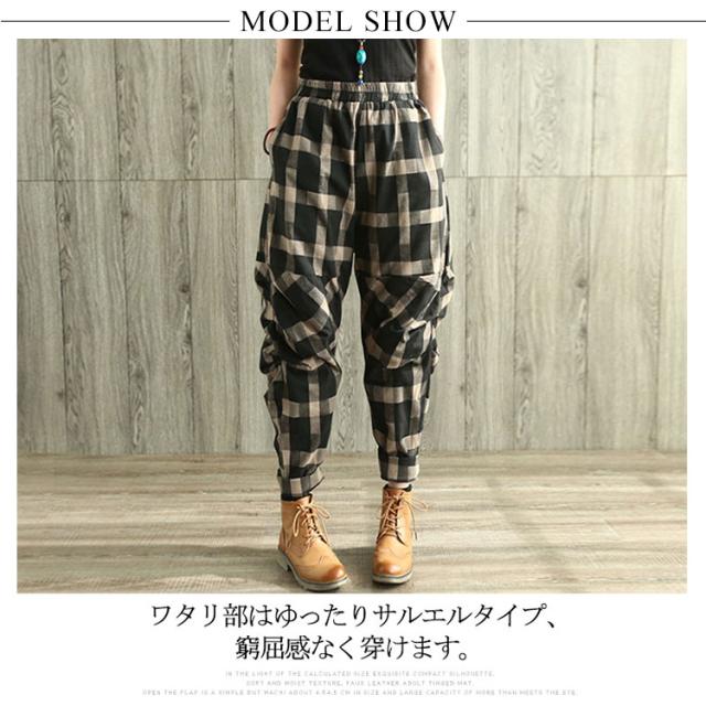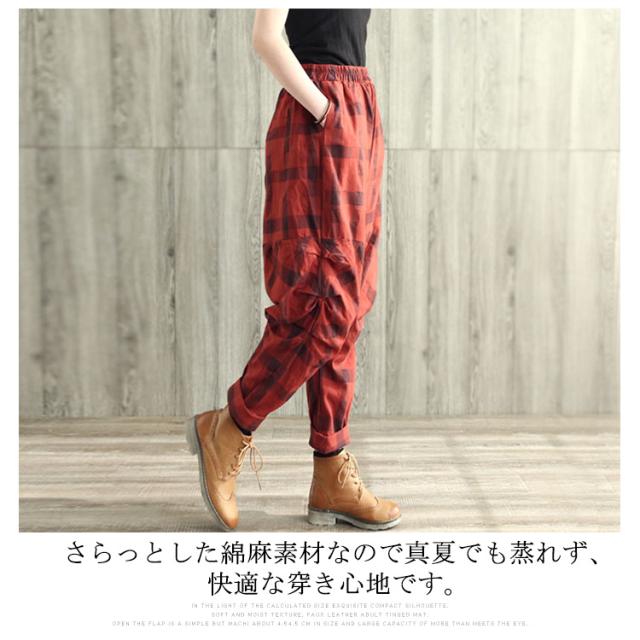 チェック柄サルエルパンツ レディースパンツ サルエル 春夏 リネン 綿麻