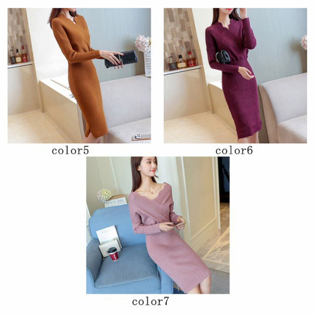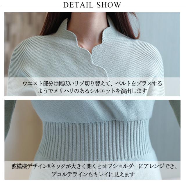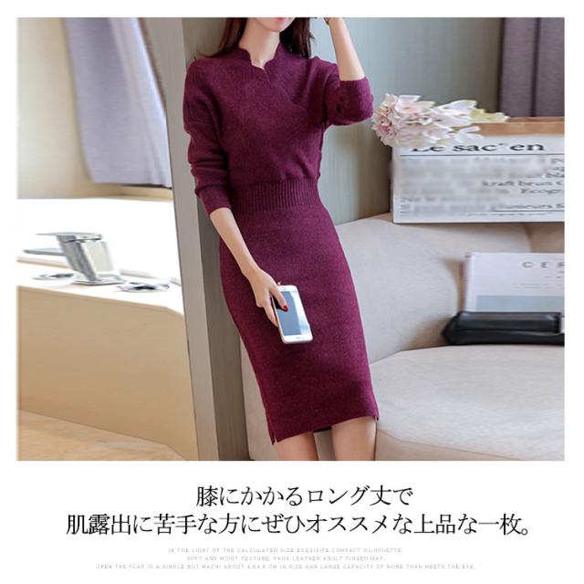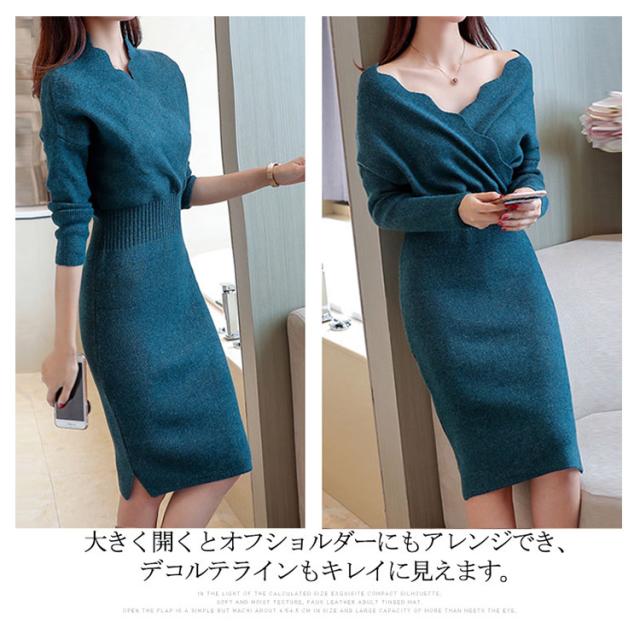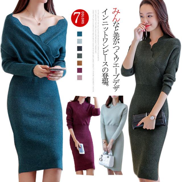 7color選べる!秋冬物 新作 ニットワンピース ロング カシュクール風 波デザイン 上品