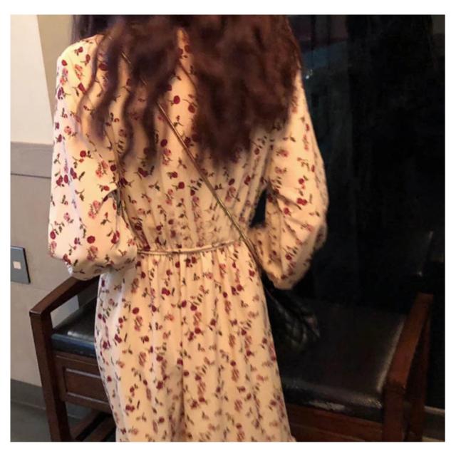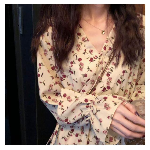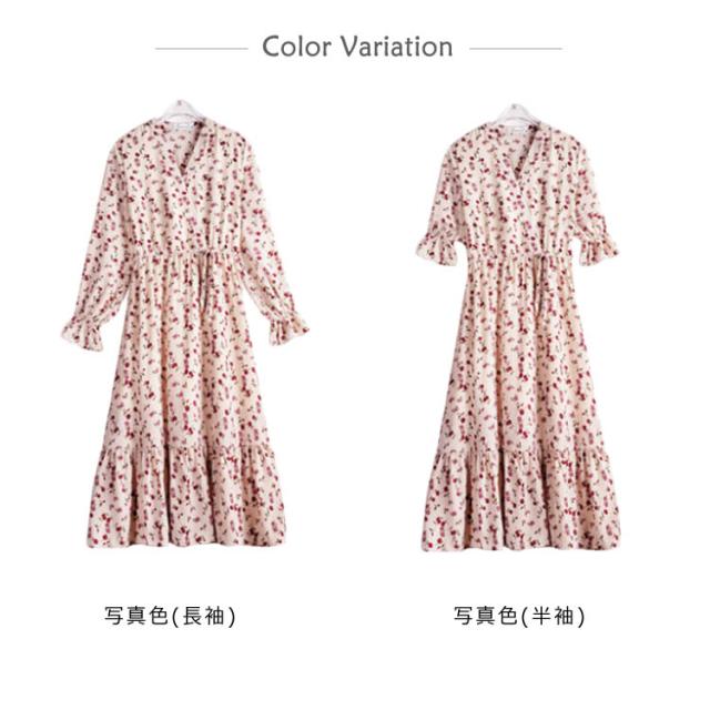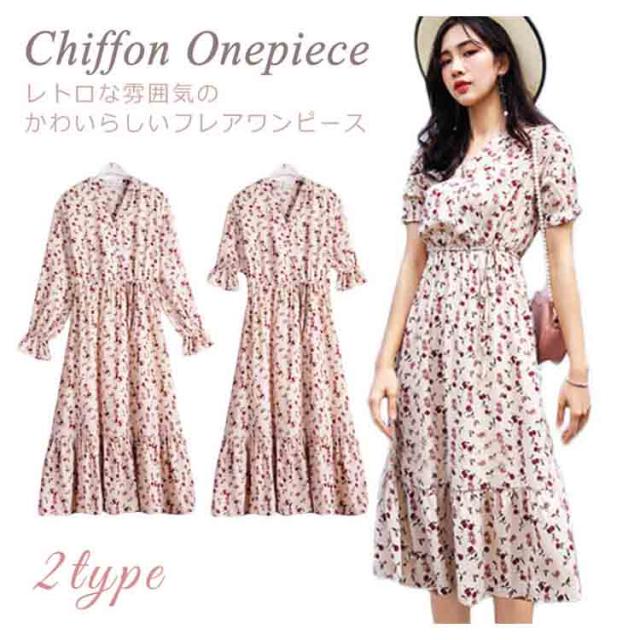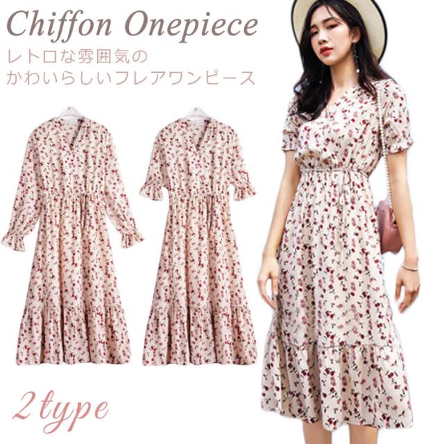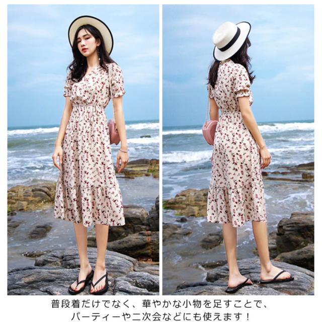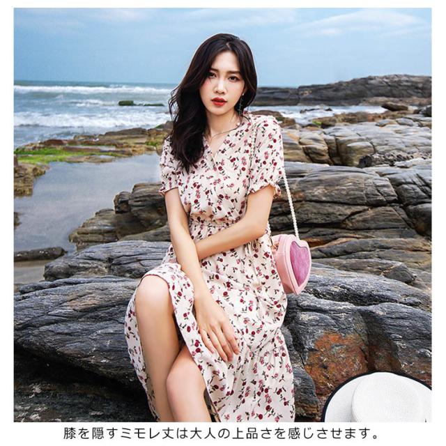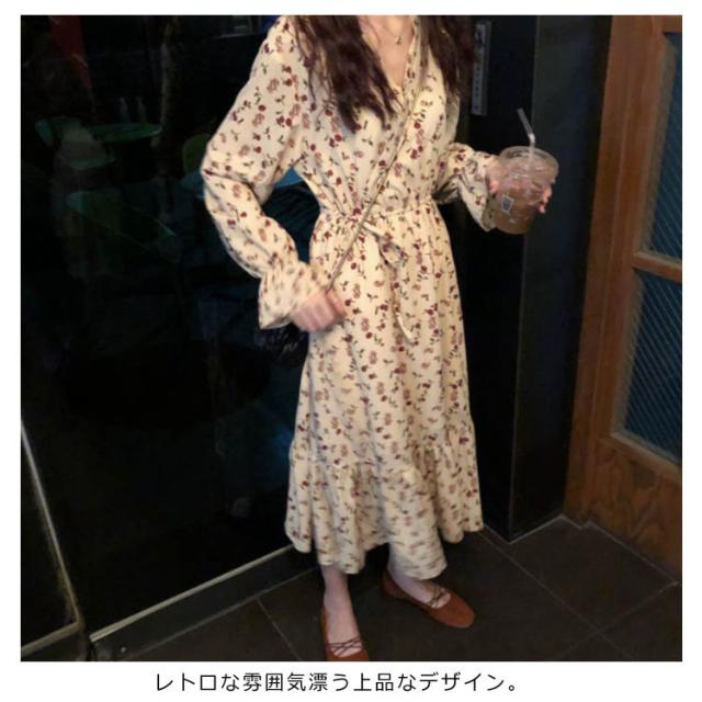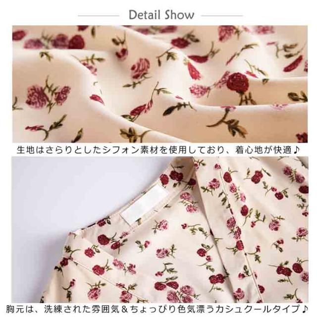 レトロ フレアワンピース ロング丈 Aライン カシュクール ワンピース Vネック ワンピース レディース 花柄 ワンピース バラ ローズ ロングワンピース シフォン ワンピース ミモレ丈 上品 着痩せ