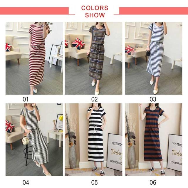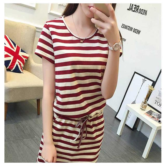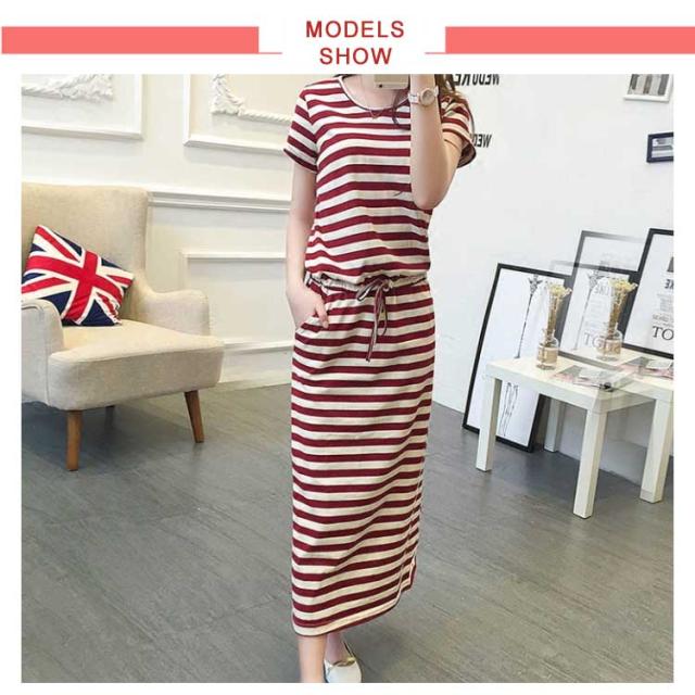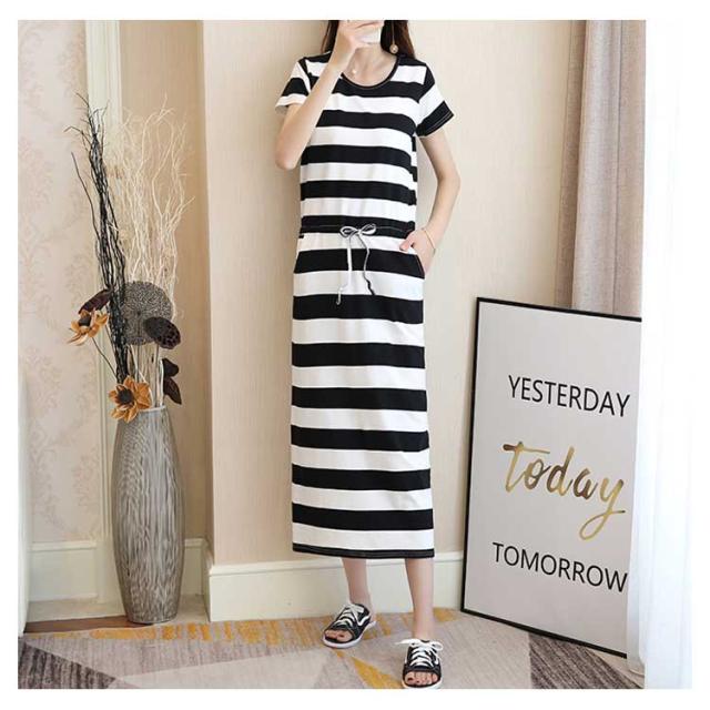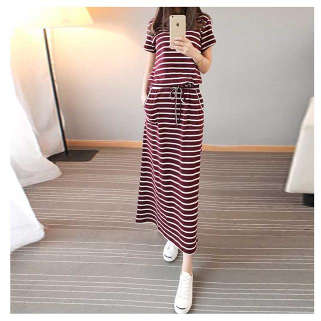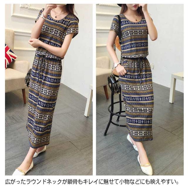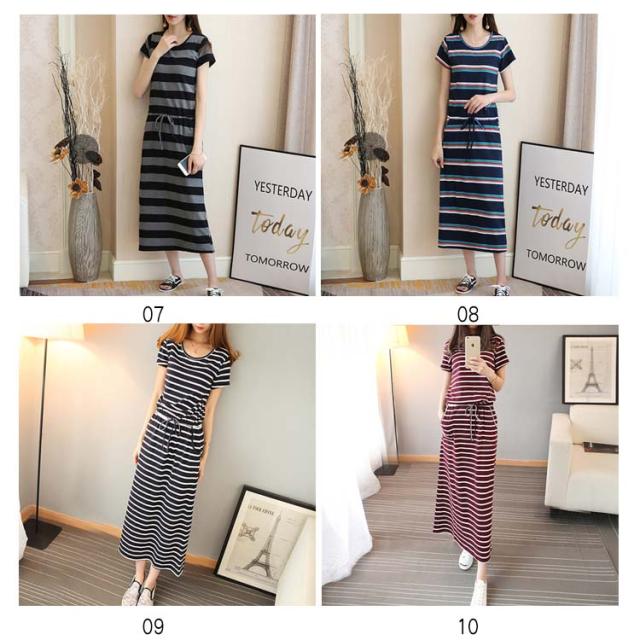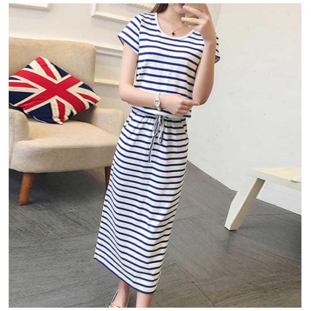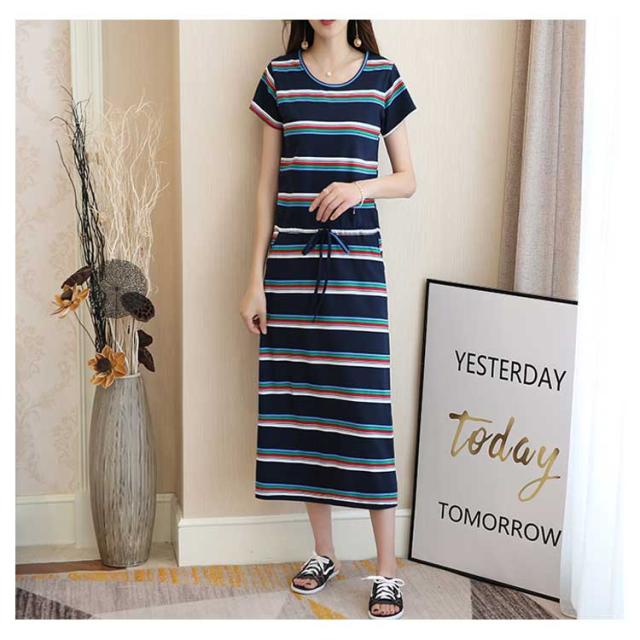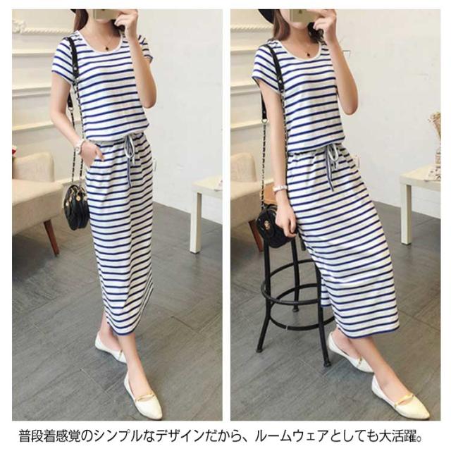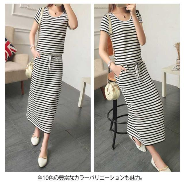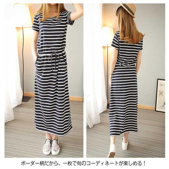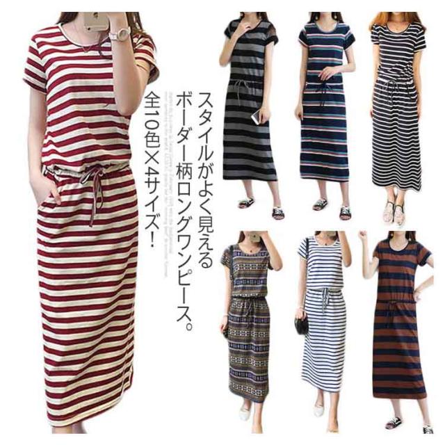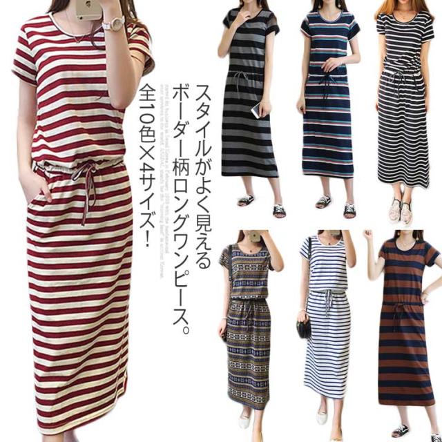 全10色×4サイズ!ボーダー柄 ワンピース 夏ワンピース 夏 ワンピース 半袖 レディース 半袖ワンピース ロング丈 ラウンドネック シンプル ウエスト紐付き Hライン 春夏 カジュアル送料無料