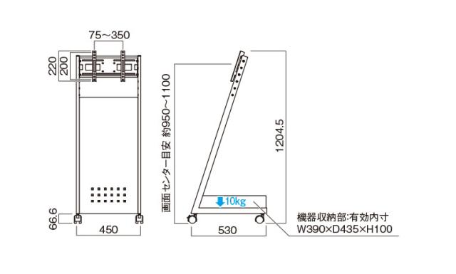 | 備考 | 上下調節:50mmピッチ 4段階 機器収納部 耐荷重:10kg以下 機器収納部 有効内寸:幅 390 × 奥行き435 × 高さ 100 (mm) |