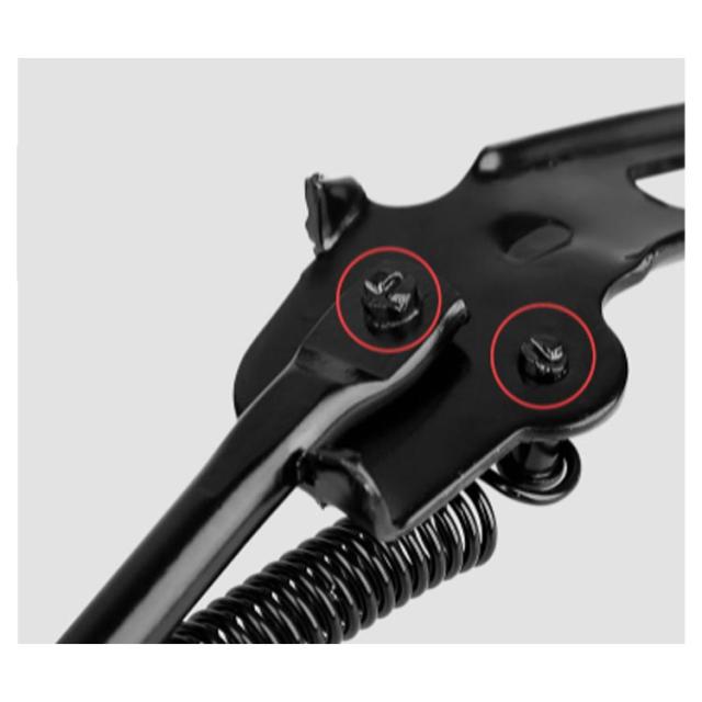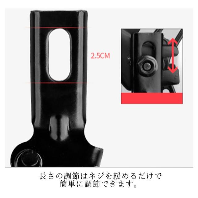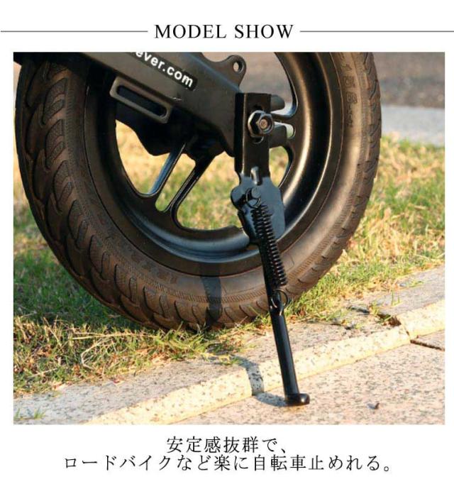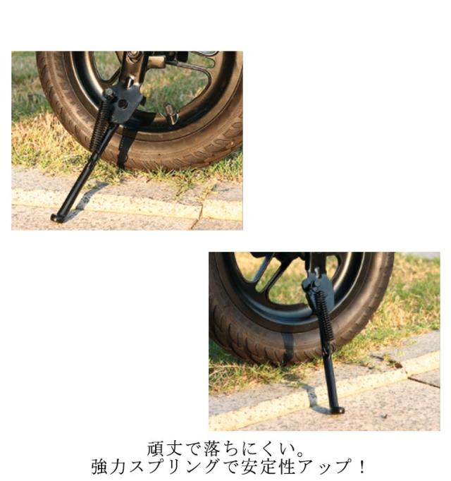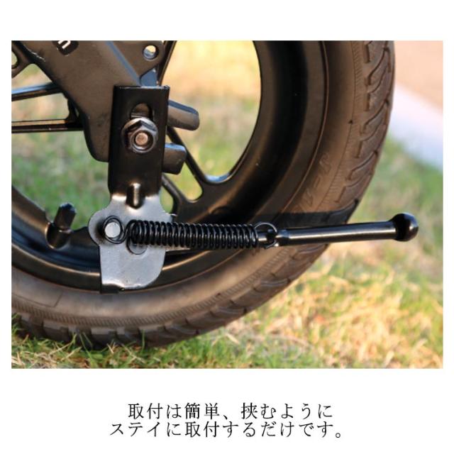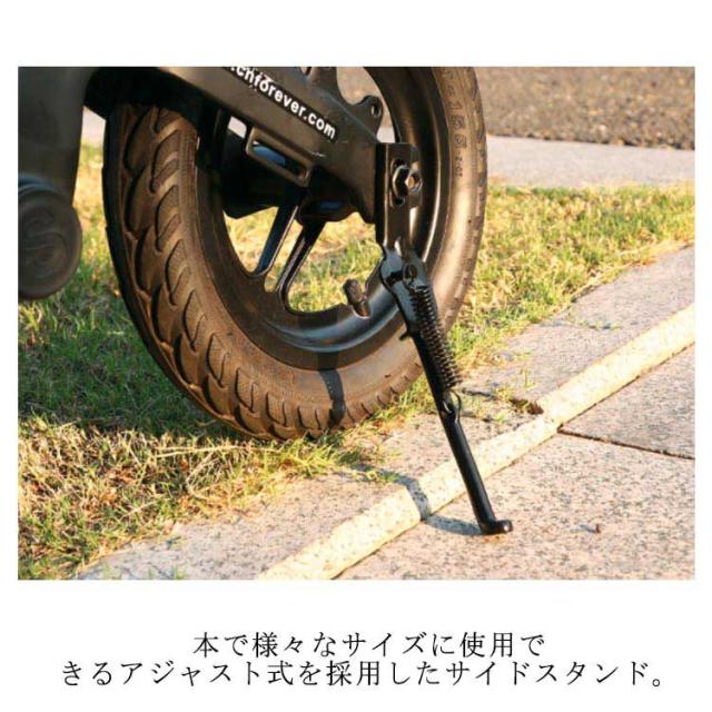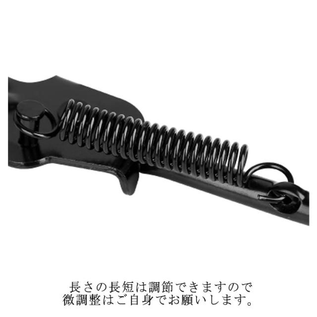 | 本で様々なサイズに使用できるアジャスト式を採用したサイドスタンド。 取付は簡単、挟むようにステイに取付するだけです。 長さの長短は調節できますので微調整はご自身でお願いします。 | |