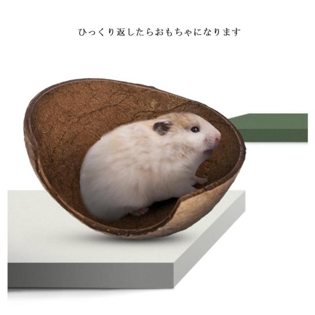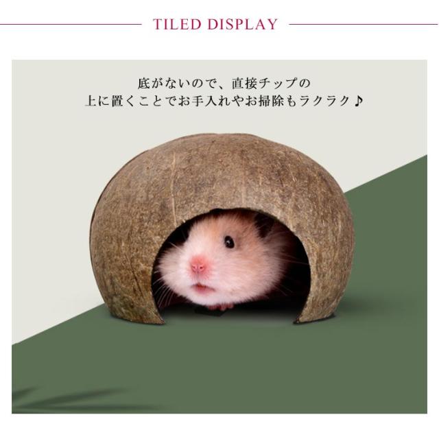 | ヤシの殻で作られた、かまくらの様なドーム型の隠れ家です。 底がないので、直接チップの上に置くことでお手入れやお掃除もラクラク♪ ハムちゃんにほどよい大きさです。 | |