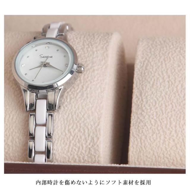 | 腕時計は3本を収納できます。 内部は時計を傷めないようにソフト素材で作られております。 ファッション感のある高級ウォッチケースです。 | |