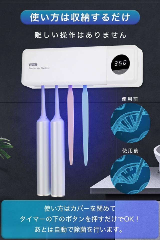 - 壁面取付部品も付属していて沢山の歯ブラシをカンタンに除菌出来そうです
