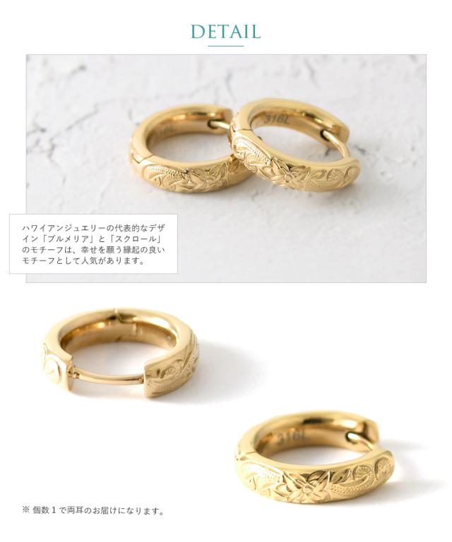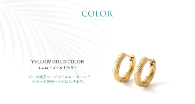 ハワイアンジュエリー ピアス フープピアス 金属アレルギー対応 ステンレス レディース キャッチレス 中折れ イエローゴールドカラー gess134yg_13mm