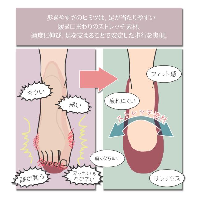 足が痛くなりにくいストレッチ素材で窮屈感を感じくく足にフィット。