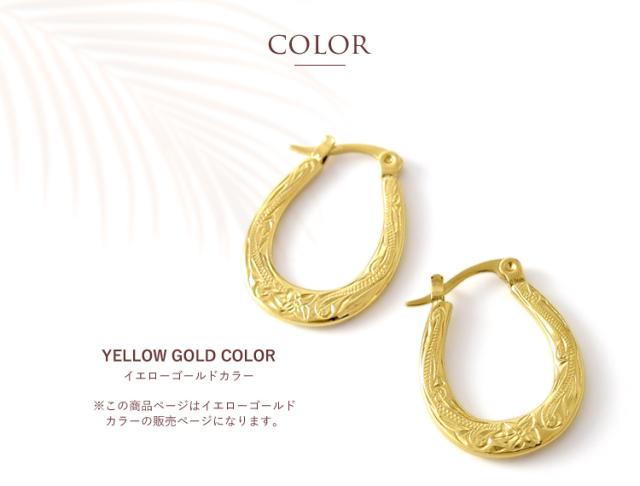 ハワイアンジュエリー ピアス オーバルフープピアス 金属アレルギー対応 ステンレス レディース キャッチレス イエローゴールドカラー gess141yg