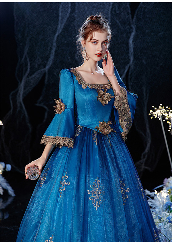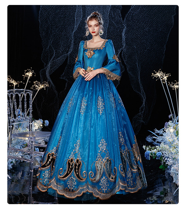 ドレス レディース ロングドレス プリンセスドレス お姫様ドレス スクエアネック ゴージャス 盛り袖 アンブレラスリーブ プリンセスライン ヴィクトリア ロココ調 宮廷衣装 王族服 カラードレス 中世貴族風 ドレス 舞台 ステージ 演劇 ヨーロッパ風 結婚式 衣装 パーティードレス サイズ指定 パニエ追加可 青 フリーサイズ d9317c0c0c6