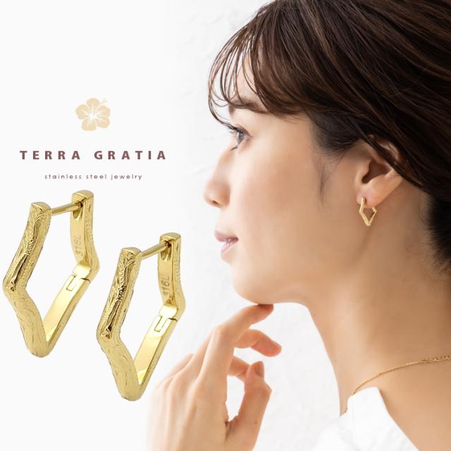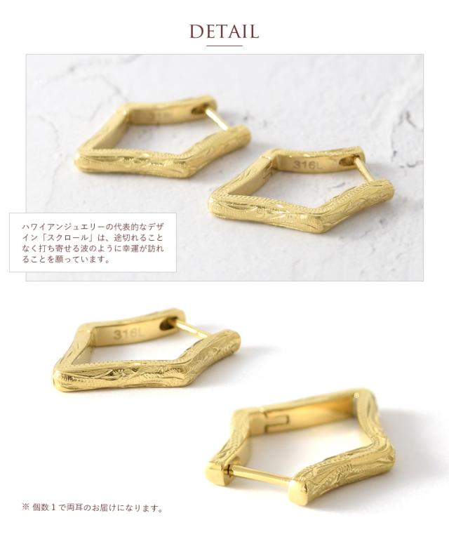 ハワイアンジュエリー ピアス ひし形 フープピアス 金属アレルギー対応 ステンレス レディース キャッチレス 中折れ イエローゴールドカラー gess293yg
