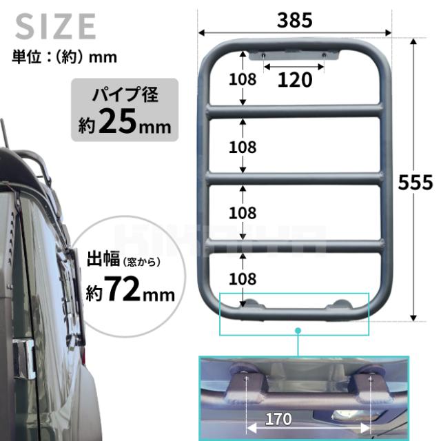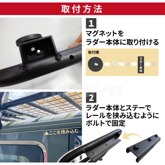 愛車のイメージチェンジに! ●ジムニーシエラ(JB74)専用の外装パーツです 車体左右どちら側でも取付可能です ●ラダーは軽量で頑丈なアルミ製 ●カラーはクールなマットブラックで、愛車のドレスアップパーツに最適です ●洗車やルーフラックへの荷積み、荷下ろしの際の足場としてもご使用いただけます ※ラダーを引っ張ると下部を固定しているマグネットが外れる場合がありますので、 十分ご注意の上体重をかけてください ●サイド上部のレールに取付部品を掛け、取付部品にボルトで固定します ラダー下部はマグネットでボディへ貼り付け固定します ●車体への傷付けを防ぐ、設置面用のゴムカバーも付属しています *ジムニー(JB64)へのお取付けも可能ですが、車幅から大きく飛び出した状態になります そのためジムニーシエラ(JB74)へのお取付けを推奨しております ※車検に関しましては各陸運局によって見解が異なるため、 弊社ではお答えいたしかねます ※記載されている【適合車種】をご確認の上ご注文ください ※製品はお客様の自己責任にて、確実なお取り付けをお願いいたします ※ご使用上の事故、損害、破損について、当社は一切の責任を負いませんので ご了承ください ※お使いのモニター設定、お部屋の照明等により、実際の製品と色味や素材感が 異なる場合がございます 品番:JMY-SL-B |