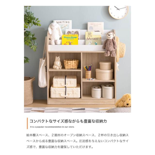 絵本棚スペース、 2箇所のオープン収納スペース、2杯の引き出し収納スペースから成る豊富な収納スペースです。