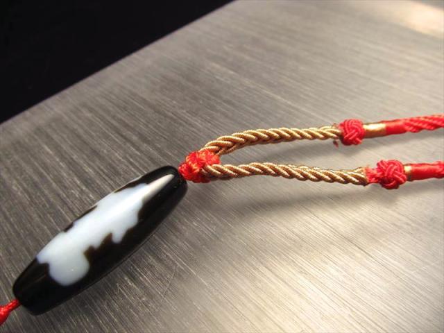 天珠・天然石が装着可能! 天珠用のデザイン紐が入荷しました! 組み紐で仕上げられており、先端部分は2本の細い紐(ひも)になっています。 そこに天珠や、天然石のビーズを通すことでネックレスとして使用することができます! 写真では天珠をひとつだけ通しておりますが、ビーズも合せて複数の石を通しても面白いですね。 ※通す穴は直径が1.5mm程度開いているとスムーズに通すことが出来ます。 サイズの調節ができる編込みになっており、引っ張るだけでサイズ調節ができます! 石の付け替えも簡単ですので、手軽に天珠や天然石を入れ替えて楽しめる新しい商品です! デザインされた組みひもでこの価格!! 激安おすすめ商品です |
