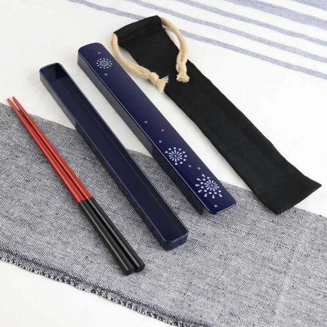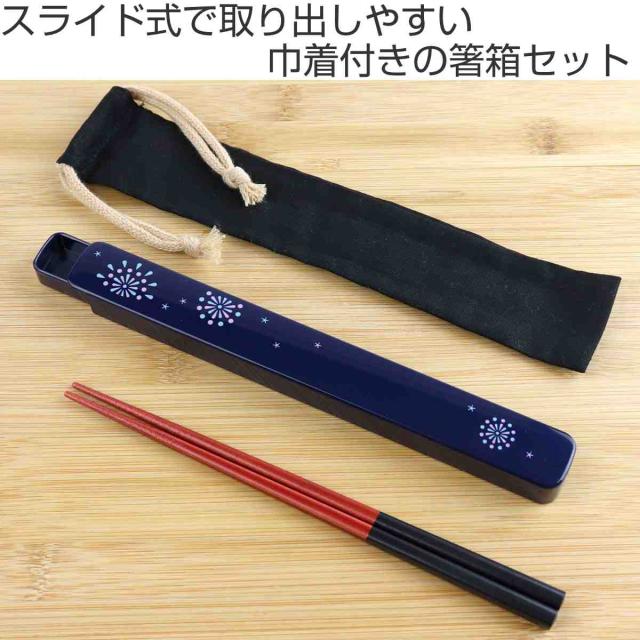 巾着付き箸箱セット 21cm 花火 ( 箸 箸箱 お箸 はし箱 セット 木製 巾着袋 お弁当用 携帯箸 女子 21センチ スライド式 天然木 弁当 お弁当 持ち運び 携帯用 女性 )
